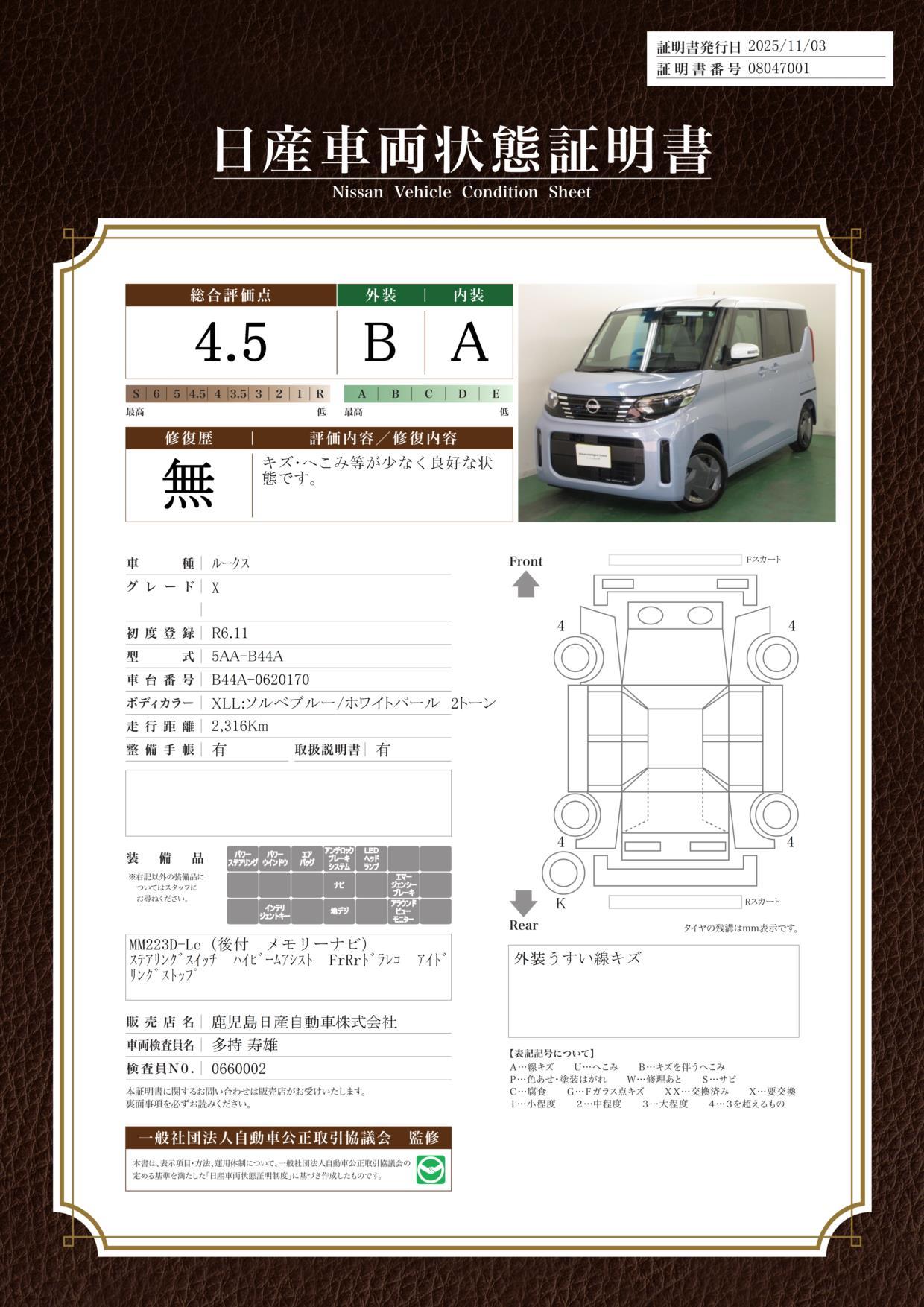 車両保証(ルークス X:鹿児島日産自動車株式会社 川内中古車センター)
