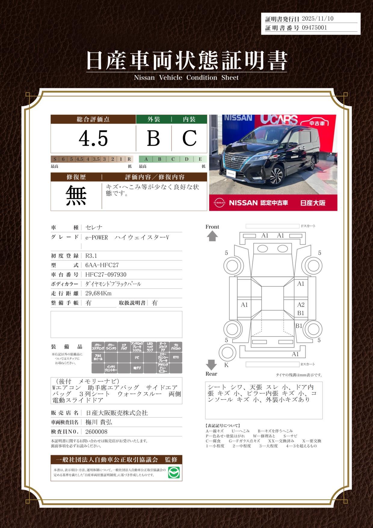 車両保証(セレナ e-パワー ハイウェイスターV:日産大阪販売株式会社 UCARS枚方)