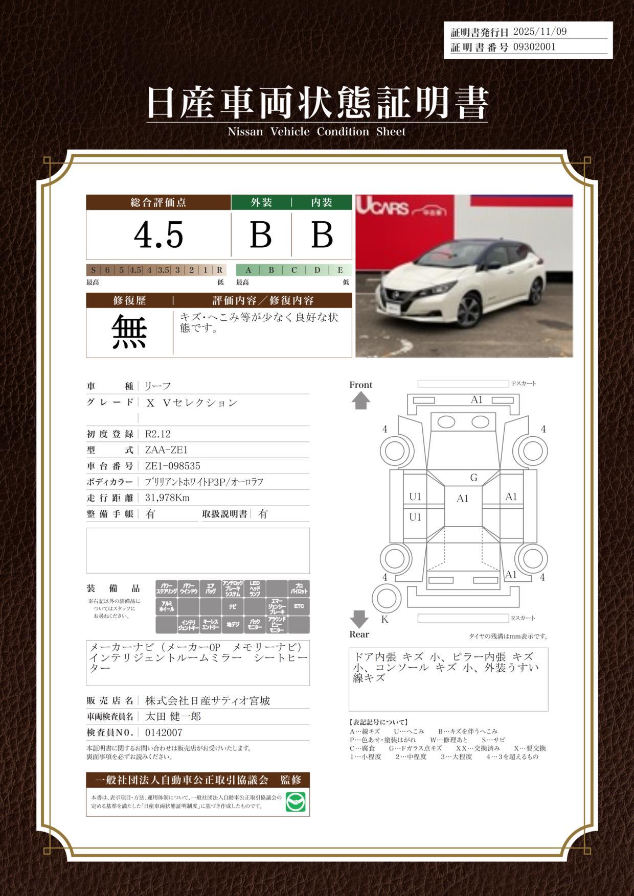 車両保証(リーフ X Vセレクション:(株)日産サティオ宮城 本社店中古車)