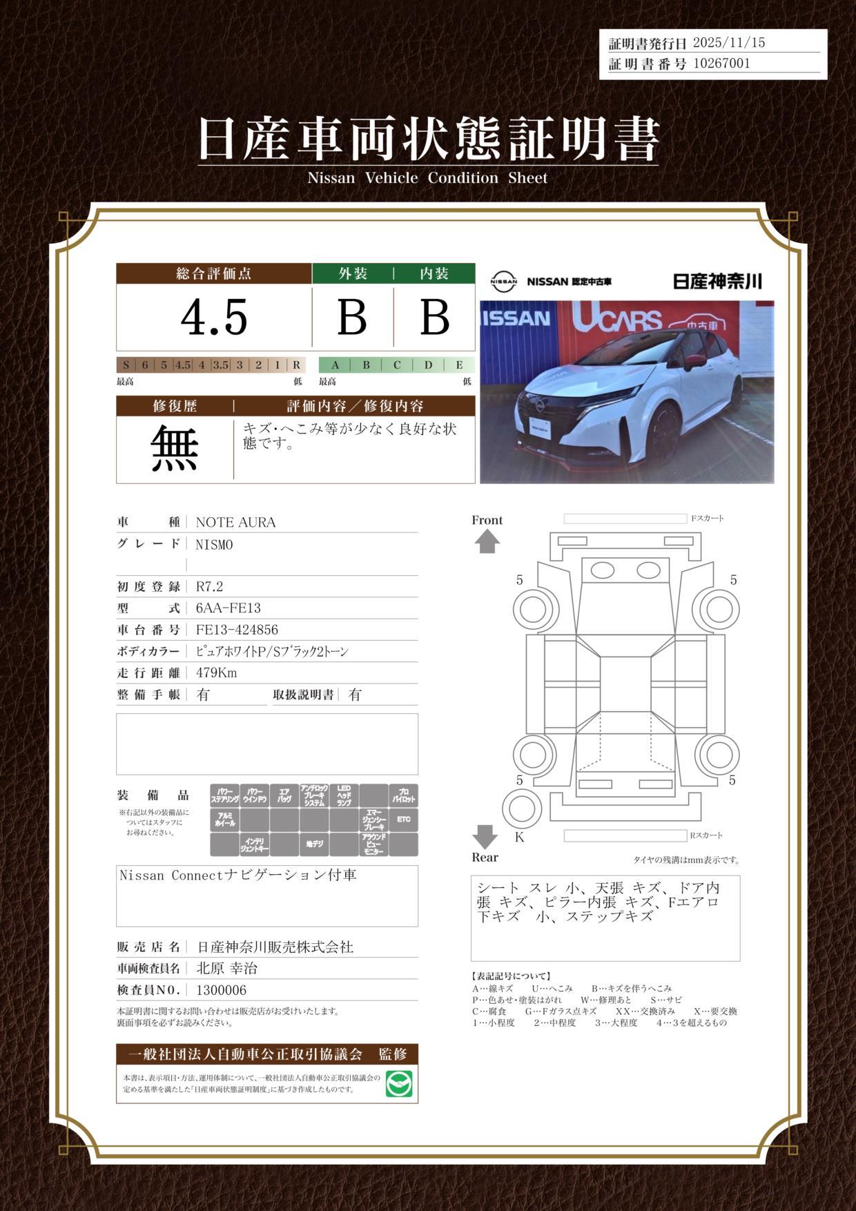 | 整備内容 | 納車前点検整備として、エンジンオイル+オイルエレメント交換&ワイパーリフィル交換等を含む、法定12ヶ月点検整備(車検整備付きは24ヶ月点検整備)相当を、日産プリンス神奈川自社整備工場にて行います。 | ||