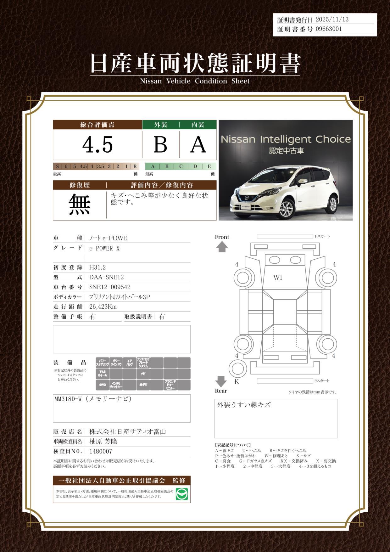 車両保証(ノート e-パワー X FOUR:富山日産自動車株式会社 富山ユーズドカーセンター)