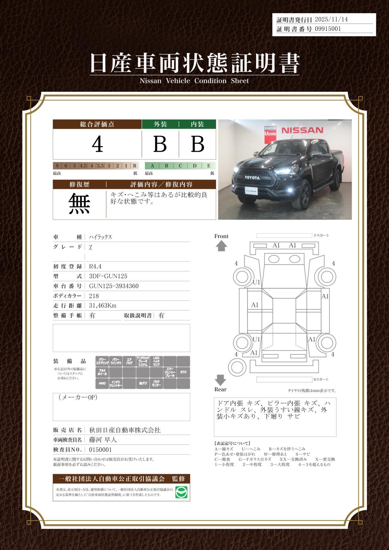 車両保証(ハイラックス Z:秋田日産自動車(株)U-CARs秋田)