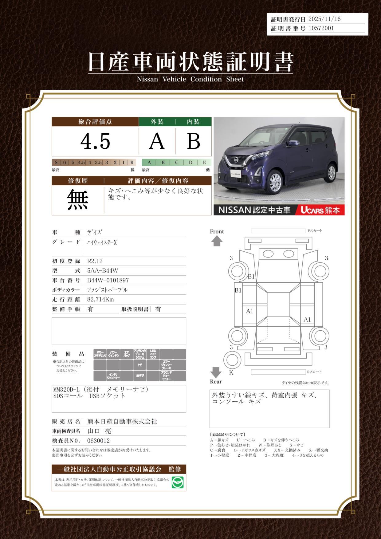 車両保証(デイズ ハイウェイスター X:熊本日産自動車(株)ユーカーズ熊本)
