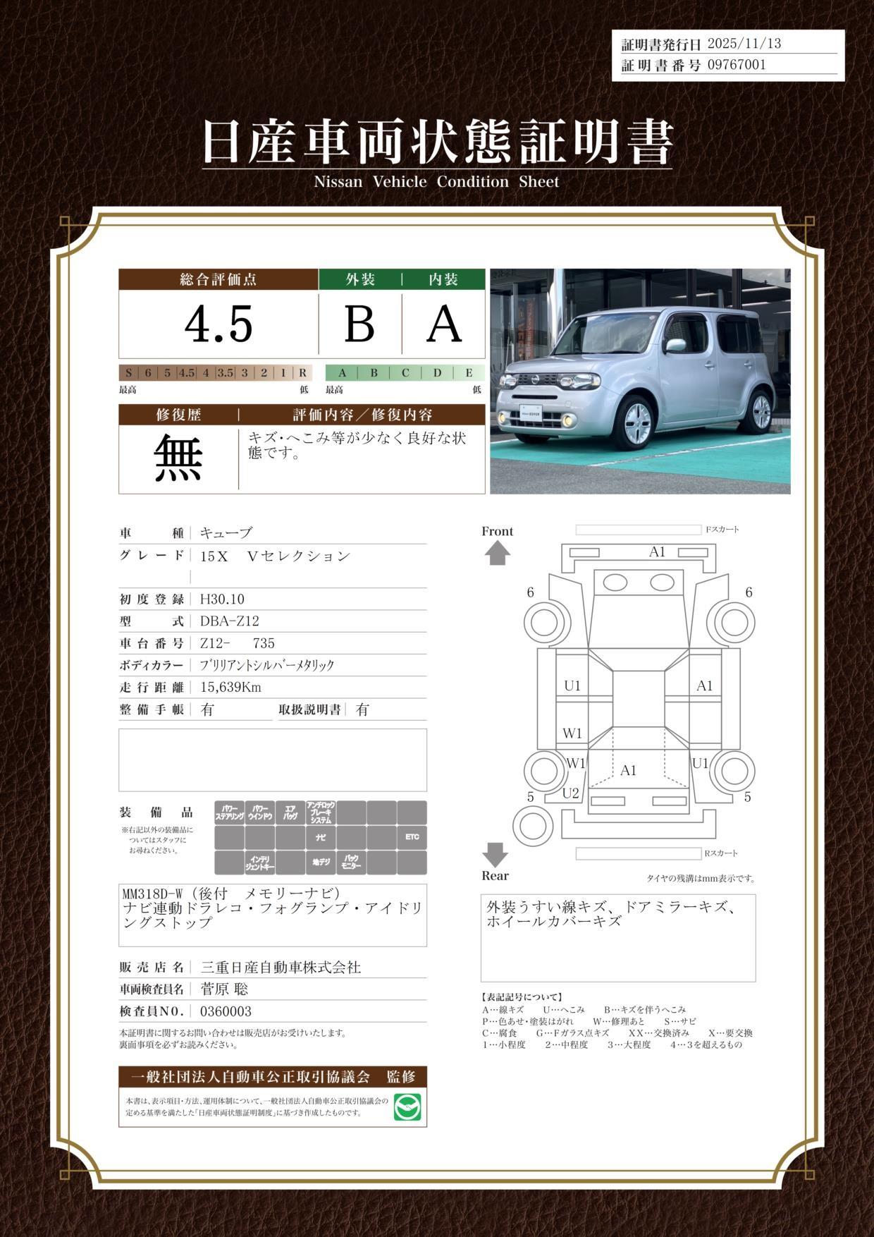 車両保証(キューブ 15X Vセレクション:三重日産自動車(株) 四日市羽津店)