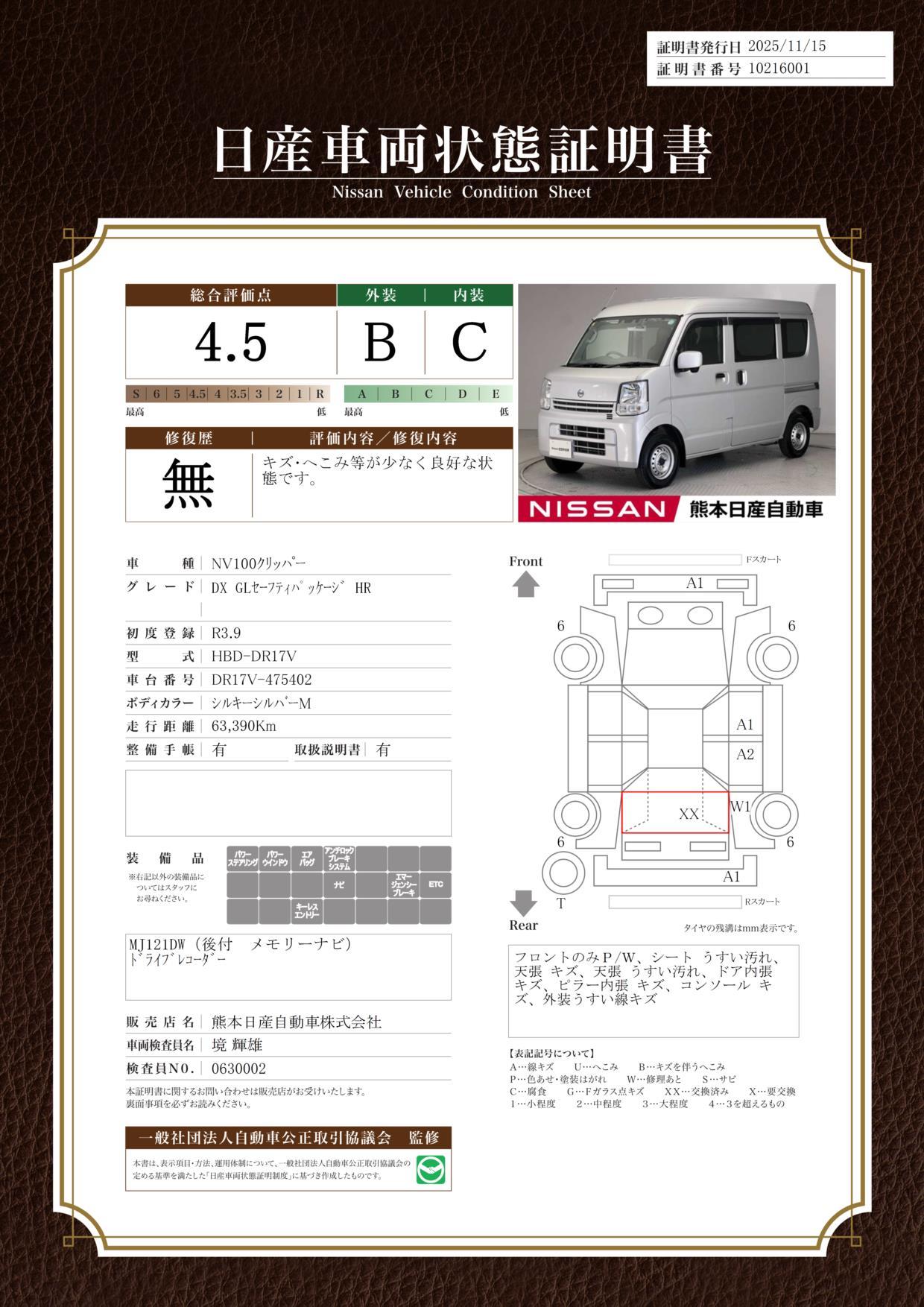 | 車両状態評価書 | ※クリックすると開きます![]() |