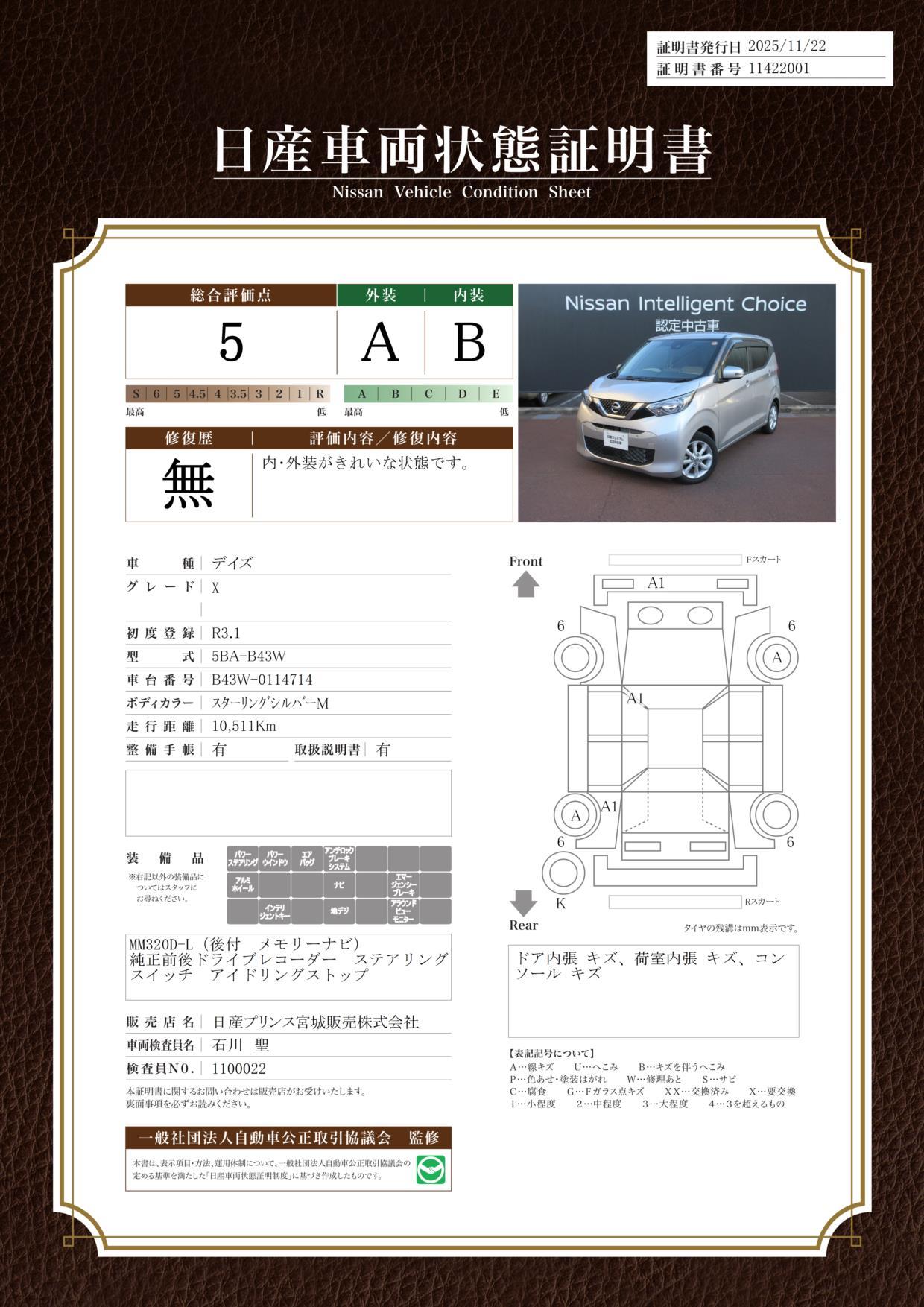 車両保証(デイズ X:日産プリンス宮城販売(株) 苦竹中古車センター)