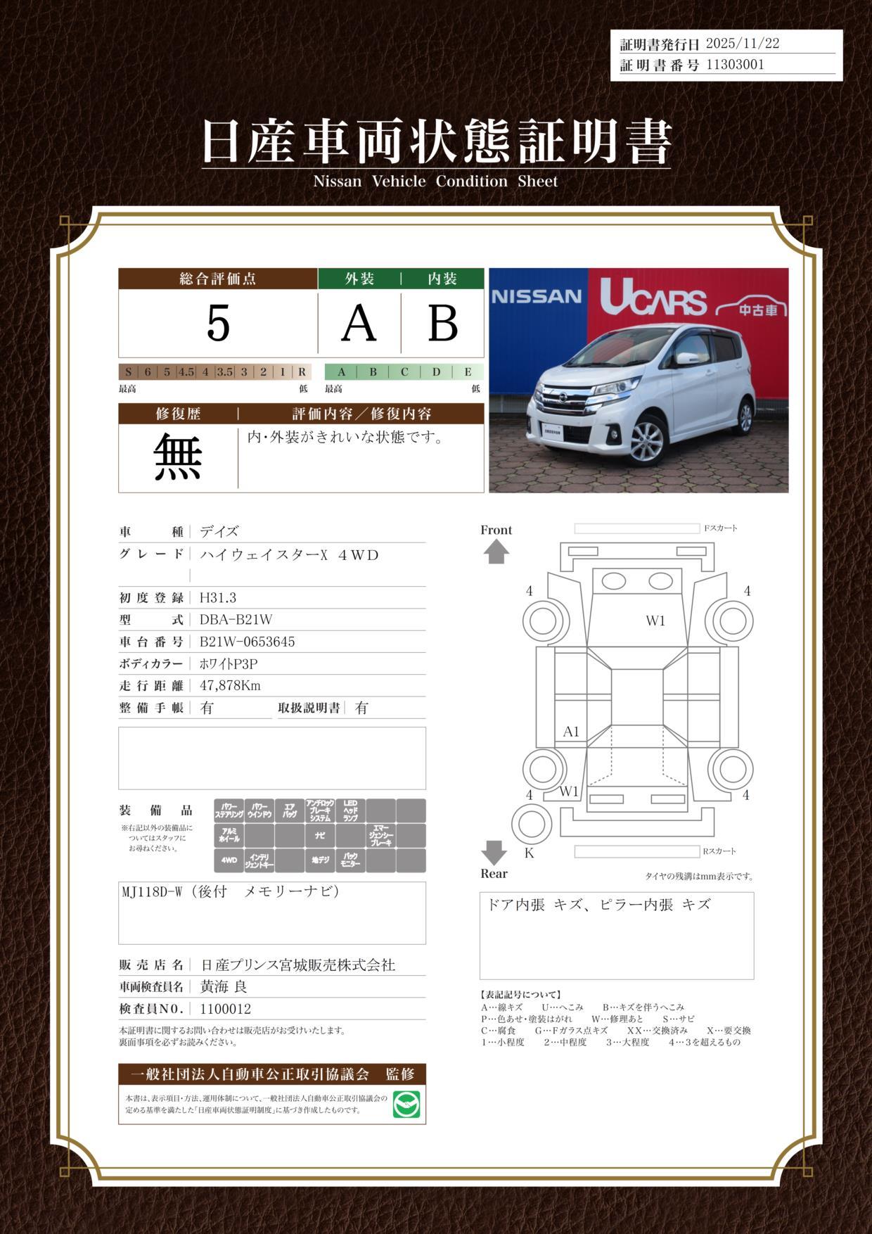 車両保証(デイズ ハイウェイスター X:日産プリンス宮城販売(株) 名取中古車センター)
