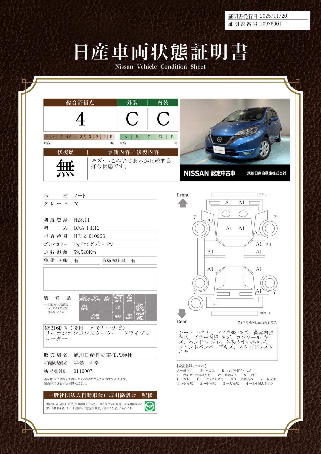 車両保証(ノート e-パワー X:旭川日産自動車(株)カーパーク神居)