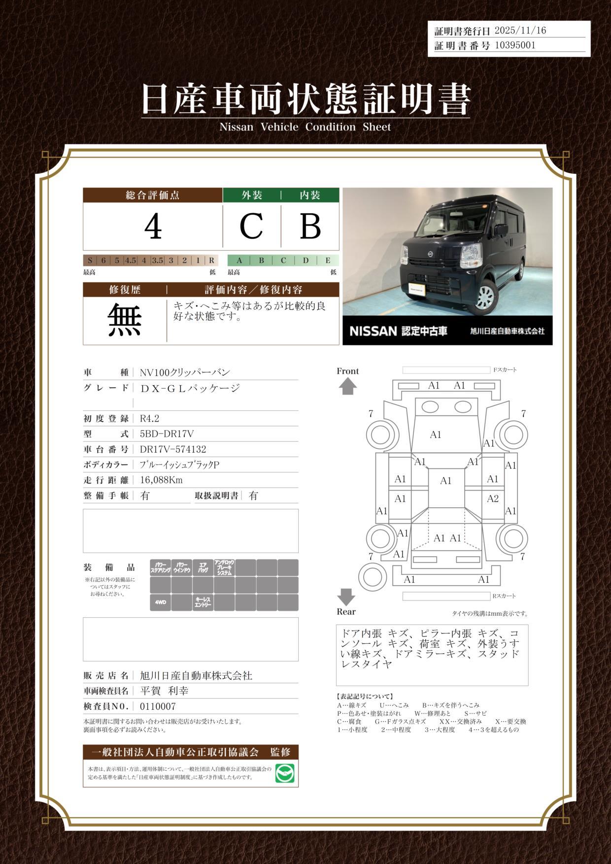 車両保証(NV100クリッパーバン DX GLパッケージ:旭川日産自動車(株) カーパーク春光)
