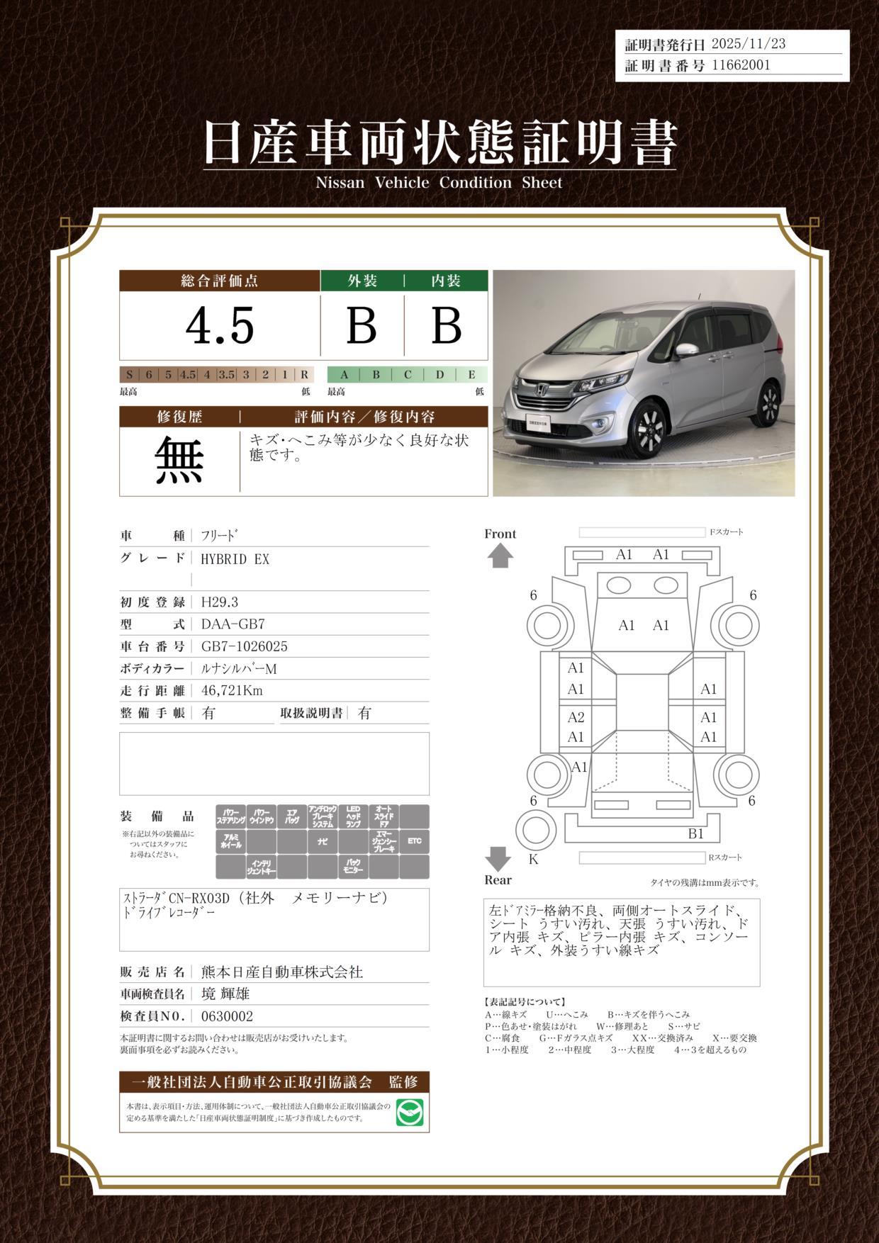 車両保証(フリードハイブリッド ハイブリッド・EX:熊本日産自動車(株)ユーカーズ熊本)