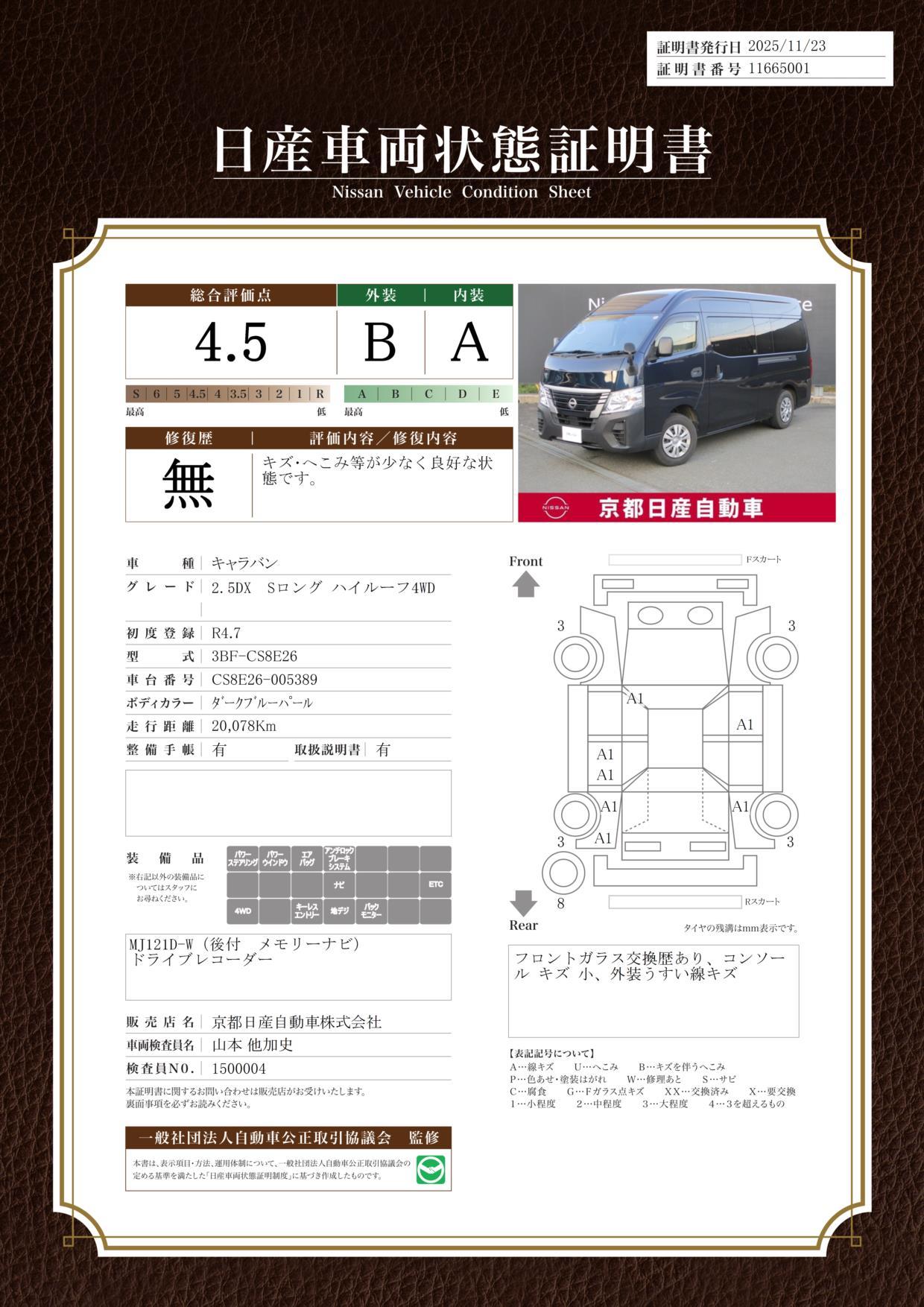 車両保証(キャラバン SロングDX:京都日産自動車(株)U・タウン福知山)