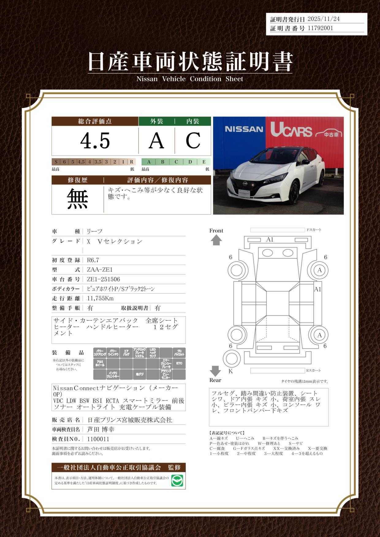 車両保証(リーフ X Vセレクション:日産プリンス宮城販売(株) 石巻中古車センター)