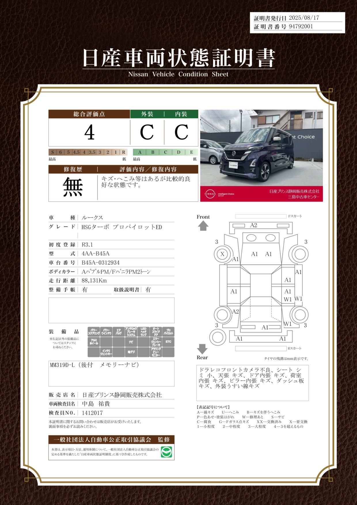 | 車両状態評価書 | ※クリックすると開きます![]() |