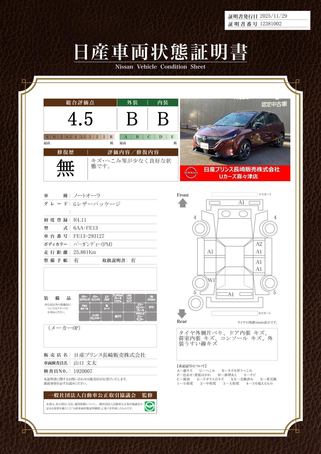 車両保証(オーラ G レザーエディション:日産プリンス長崎販売(株) Uカーズ喜々津店)