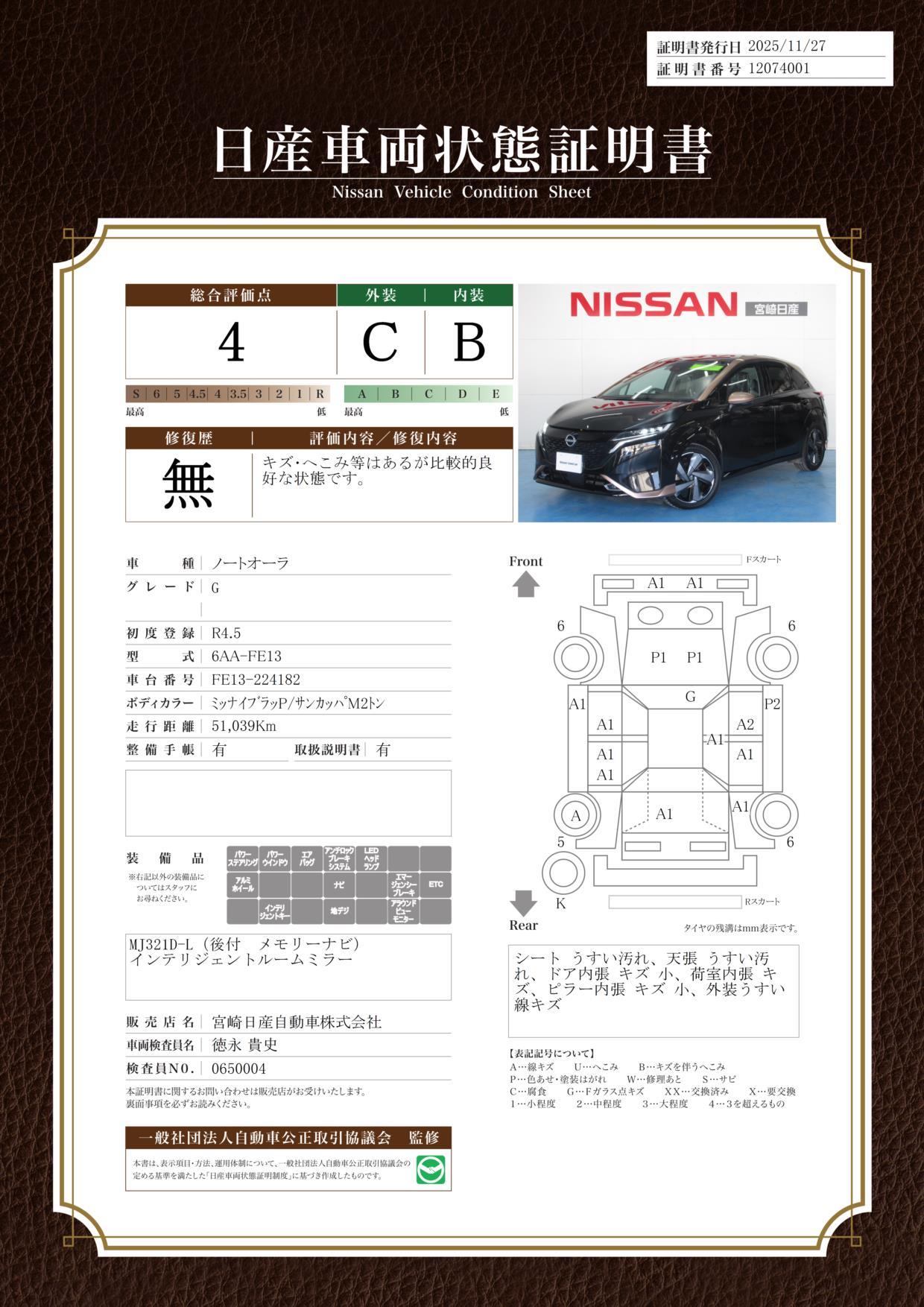 車両保証(オーラ G:宮崎日産自動車 都城カーセンター)