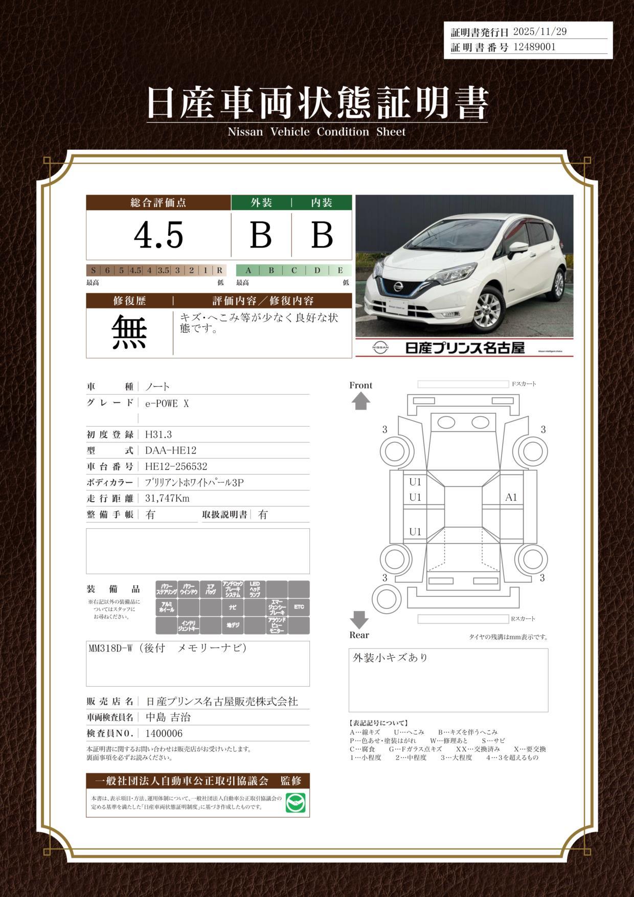 車両保証(ノート e-パワー X:日産プリンス名古屋販売(株) 日産カーパレス小牧インター)