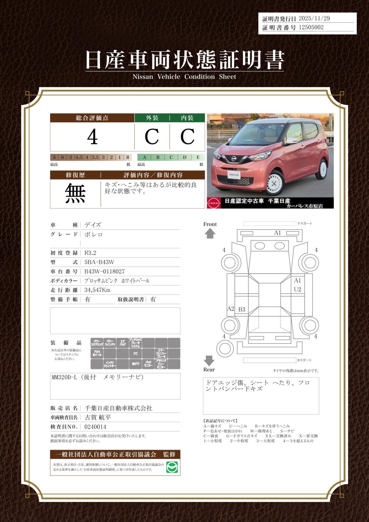 車両保証(デイズ ボレロ:千葉日産自動車株式会社 カーパレス市原)