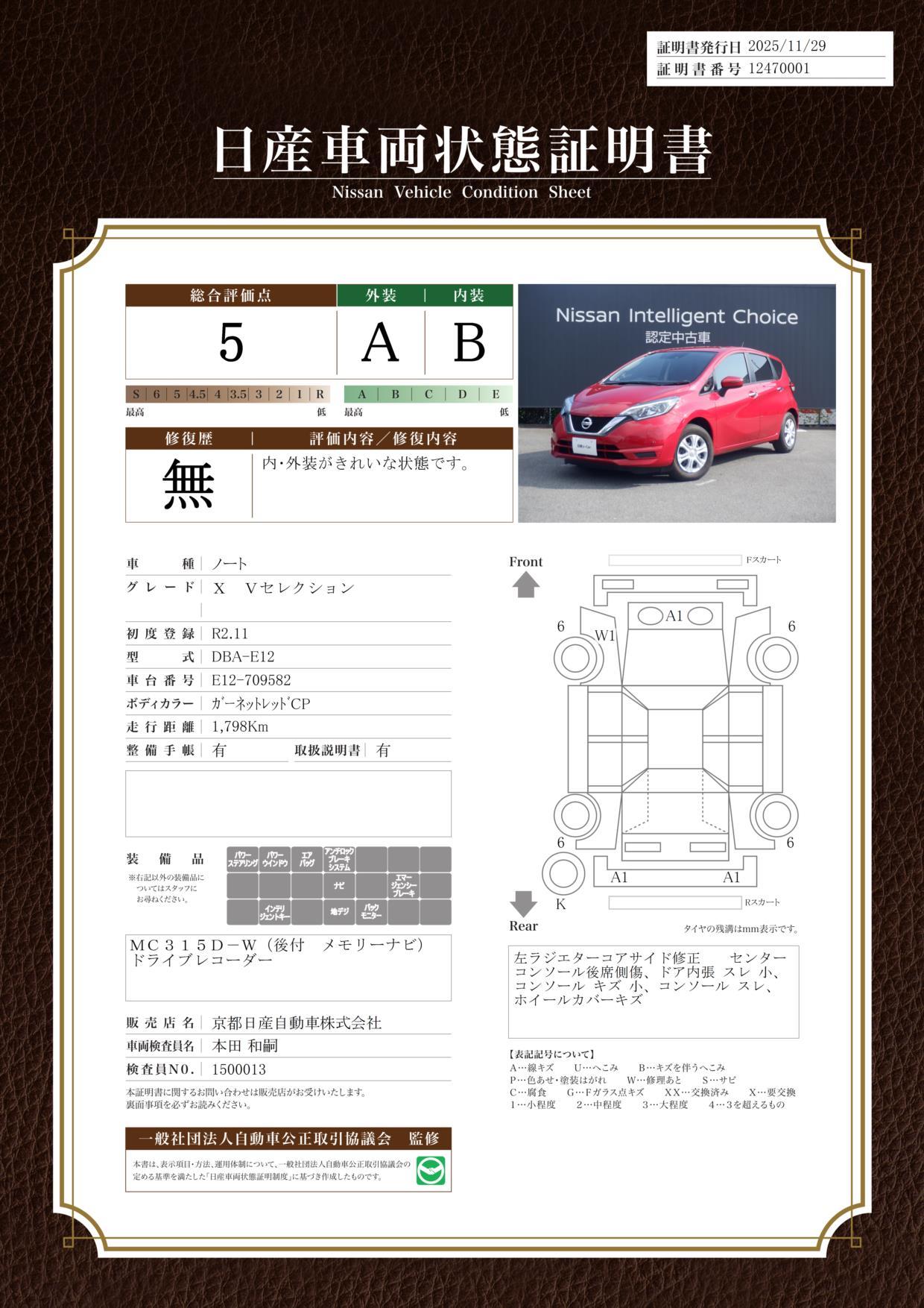 車両保証(ノート X Vセレクション:京都日産自動車(株)日産カーパレス伏見)
