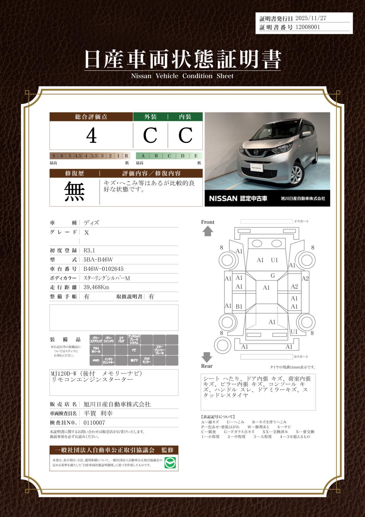 車両保証(デイズ X:旭川日産自動車(株)カーパーク神居)