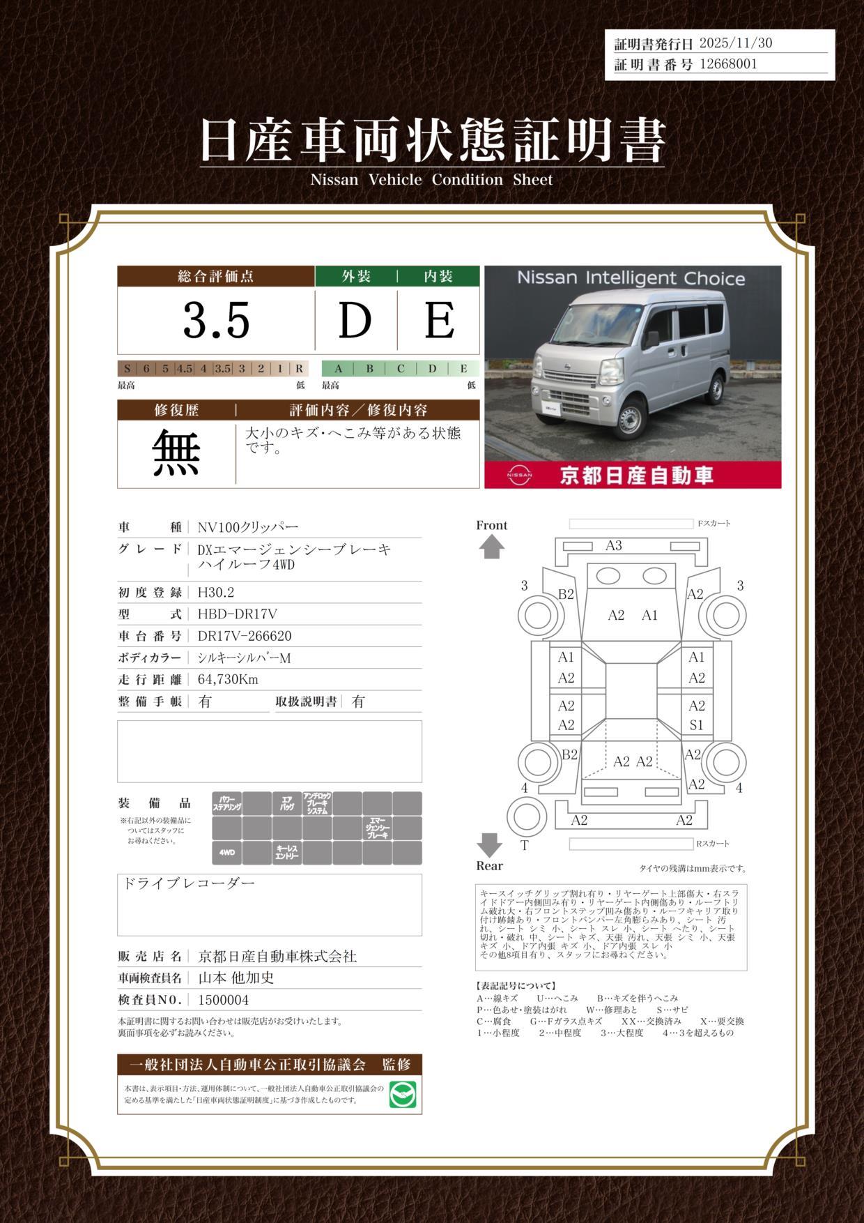車両保証(NV100クリッパーバン DX エマージェンシーブレーキパッケージ:京都日産自動車(株)U・タウン福知山)