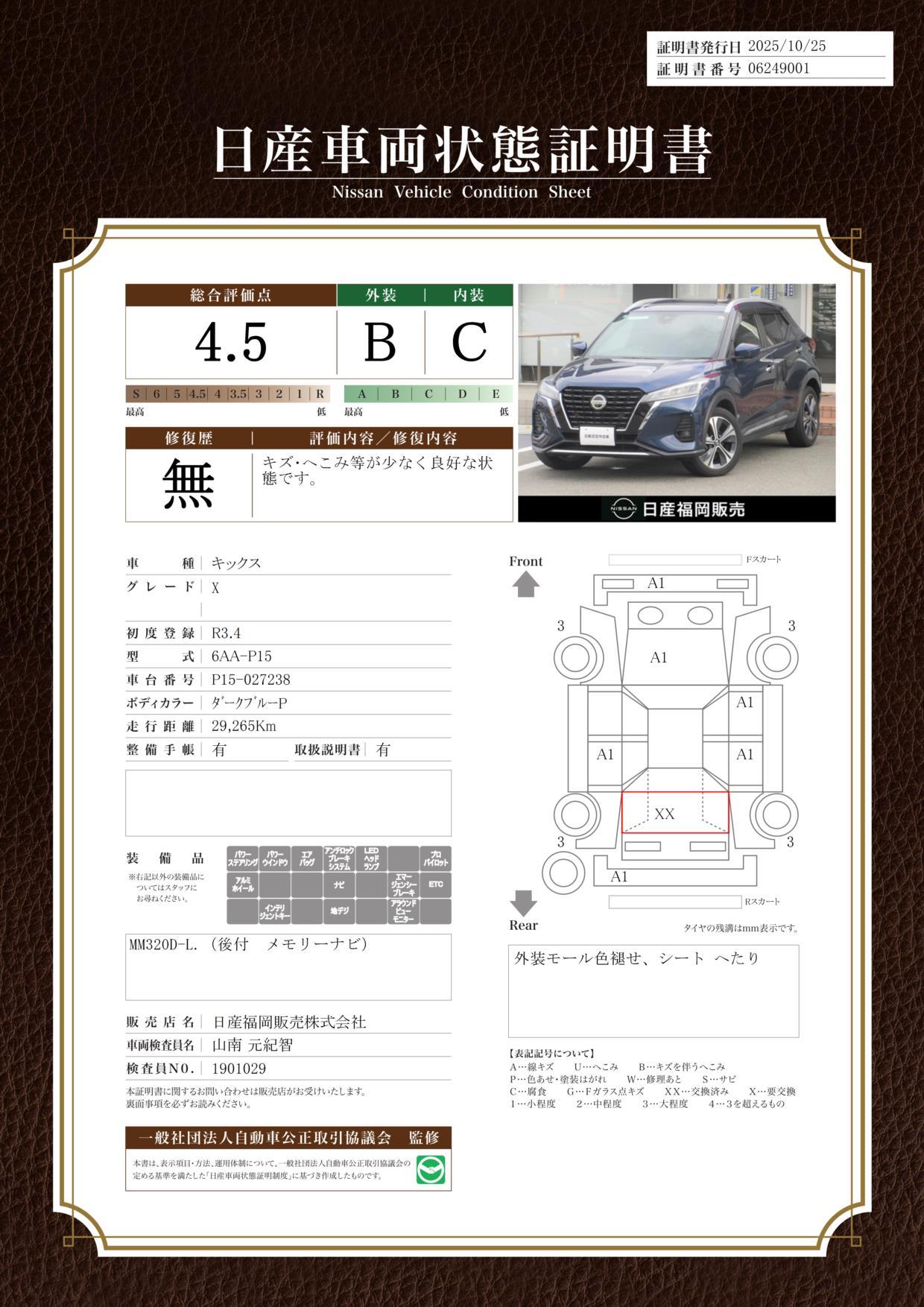 車両保証(キックス X:日産福岡販売(株)久留米マイカーセンター)