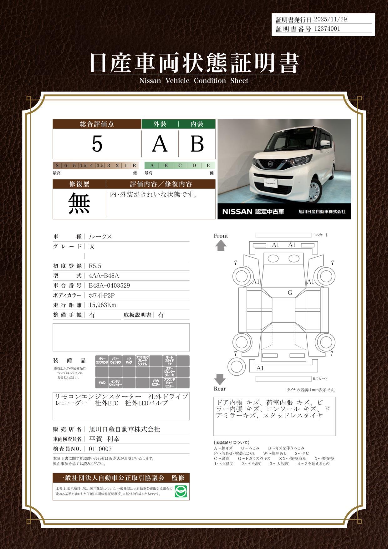 車両保証(ルークス Xターボ:旭川日産自動車(株) カーパーク春光)