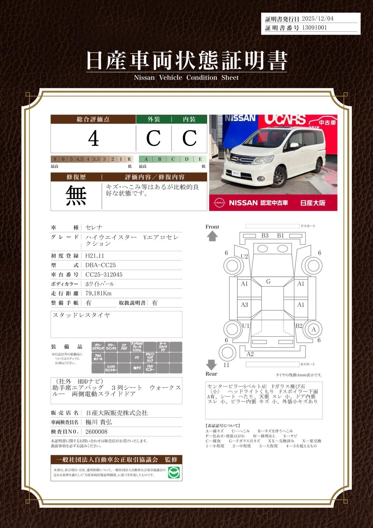 車両保証(セレナ ハイウェイスター Vエアロセレクション:日産大阪販売株式会社 UCARS枚方)