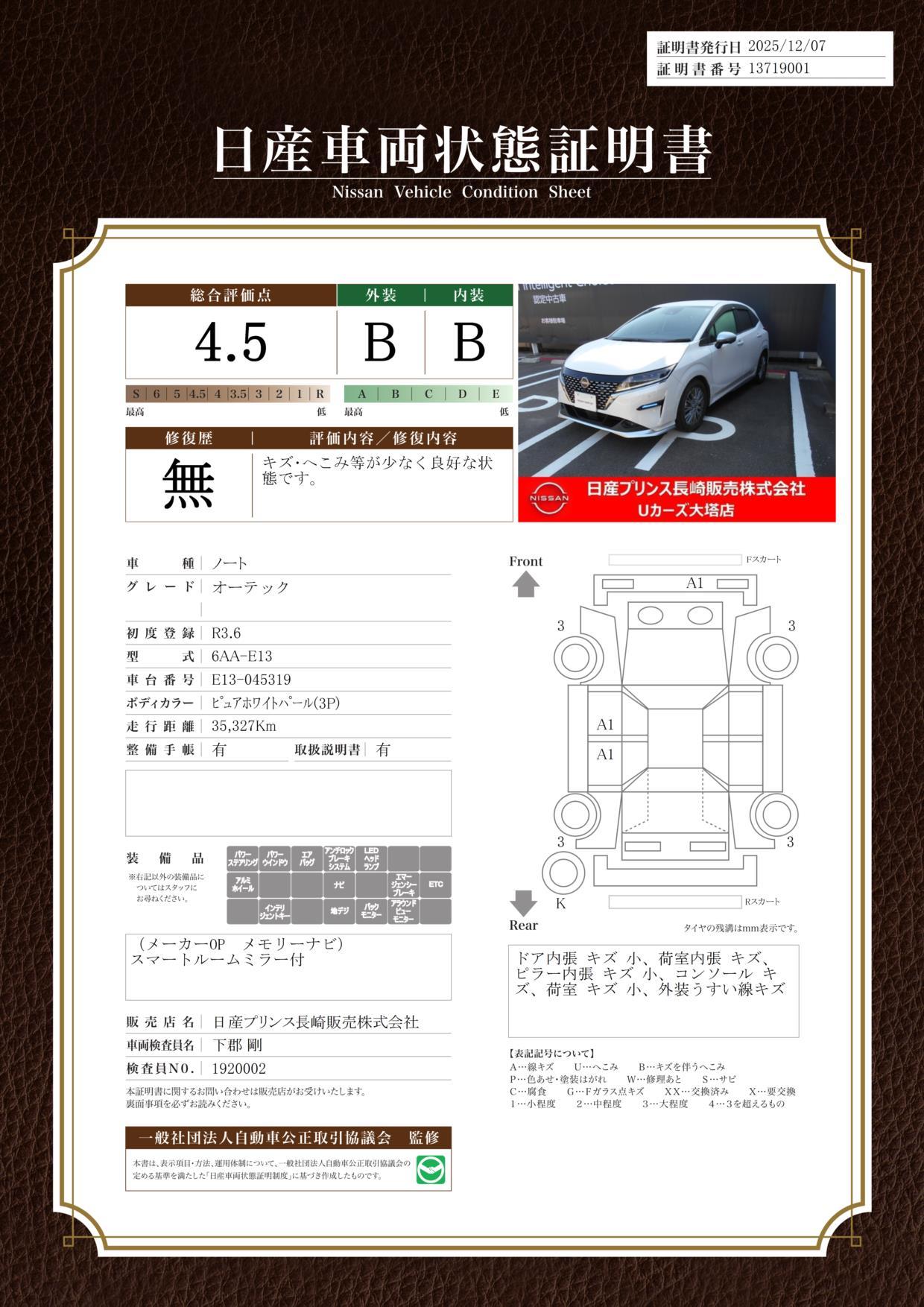車両保証(ノート オーテック:日産プリンス長崎販売(株) Uカーズ大塔店)