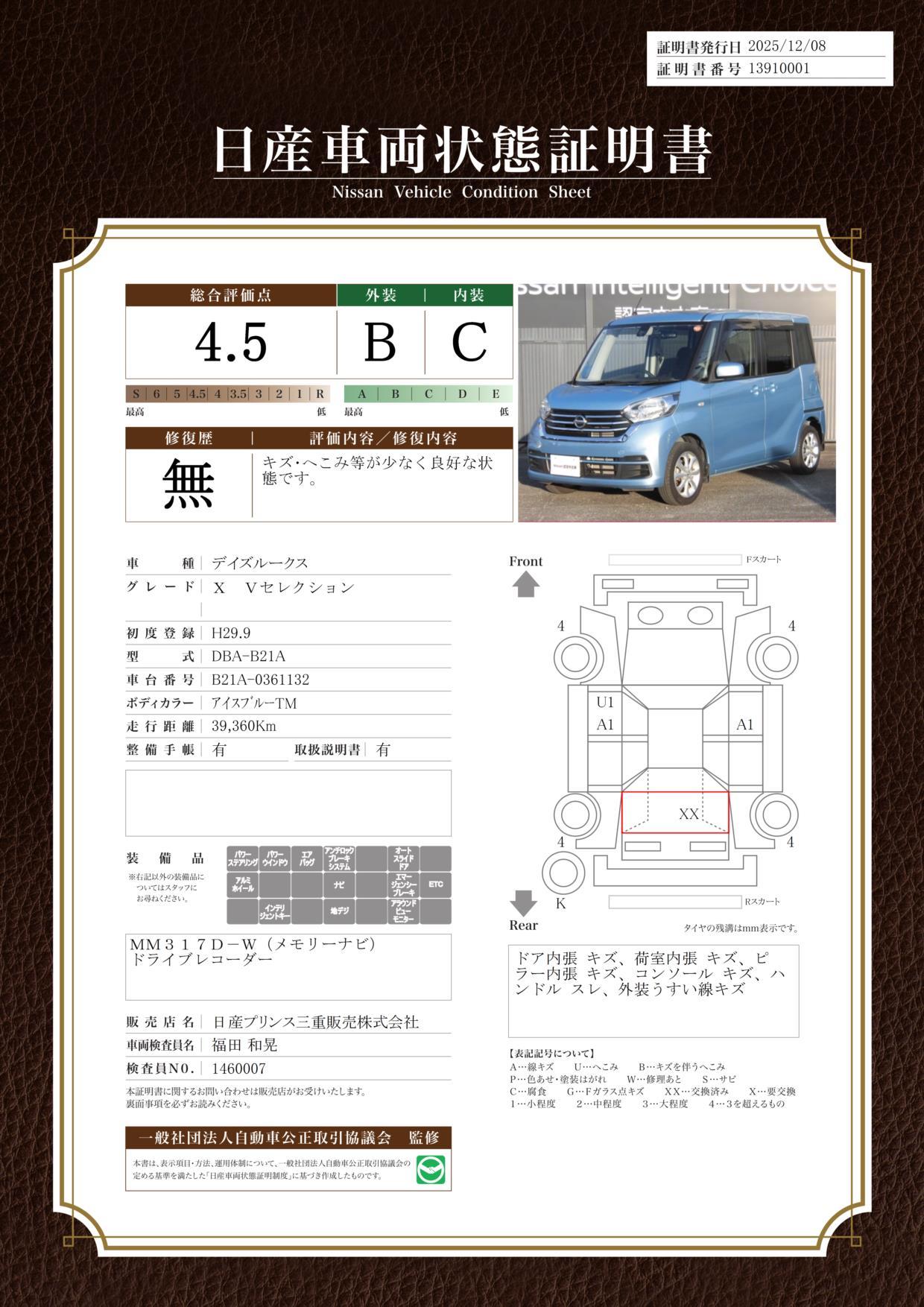 車両保証(デイズルークス X Vセレクション:日産プリンス三重販売(株) U-Car松阪)
