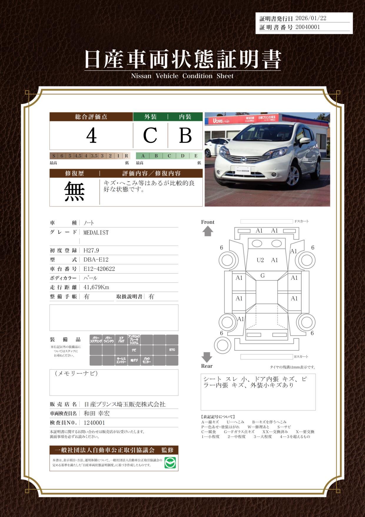 車両保証(ノート メダリスト:日産プリンス埼玉販売(株) ユーカーズ東松山)