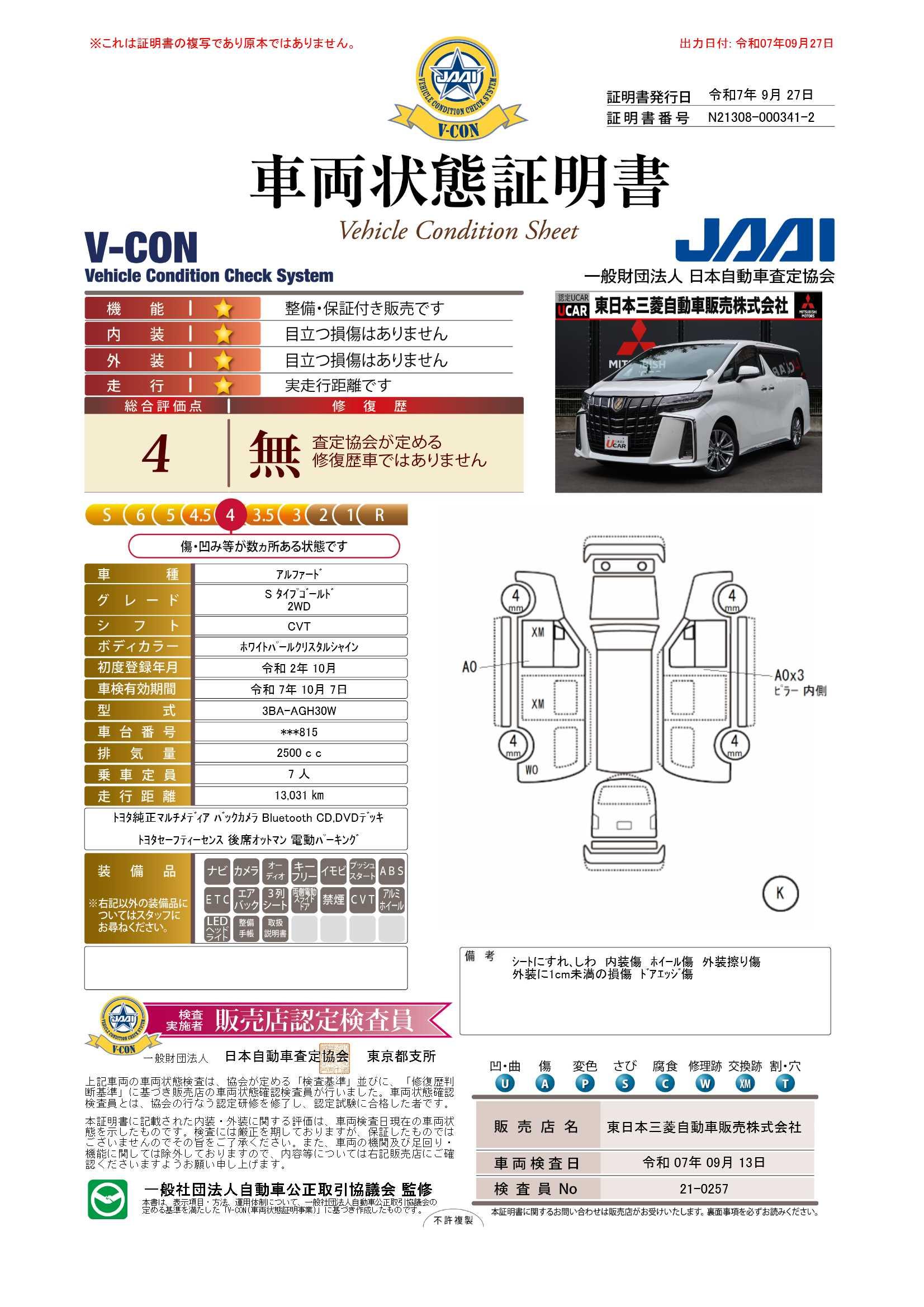 車両保証(アルファード 2.5S タイプゴールド:東日本三菱自動車販売(株) UCAR田無)