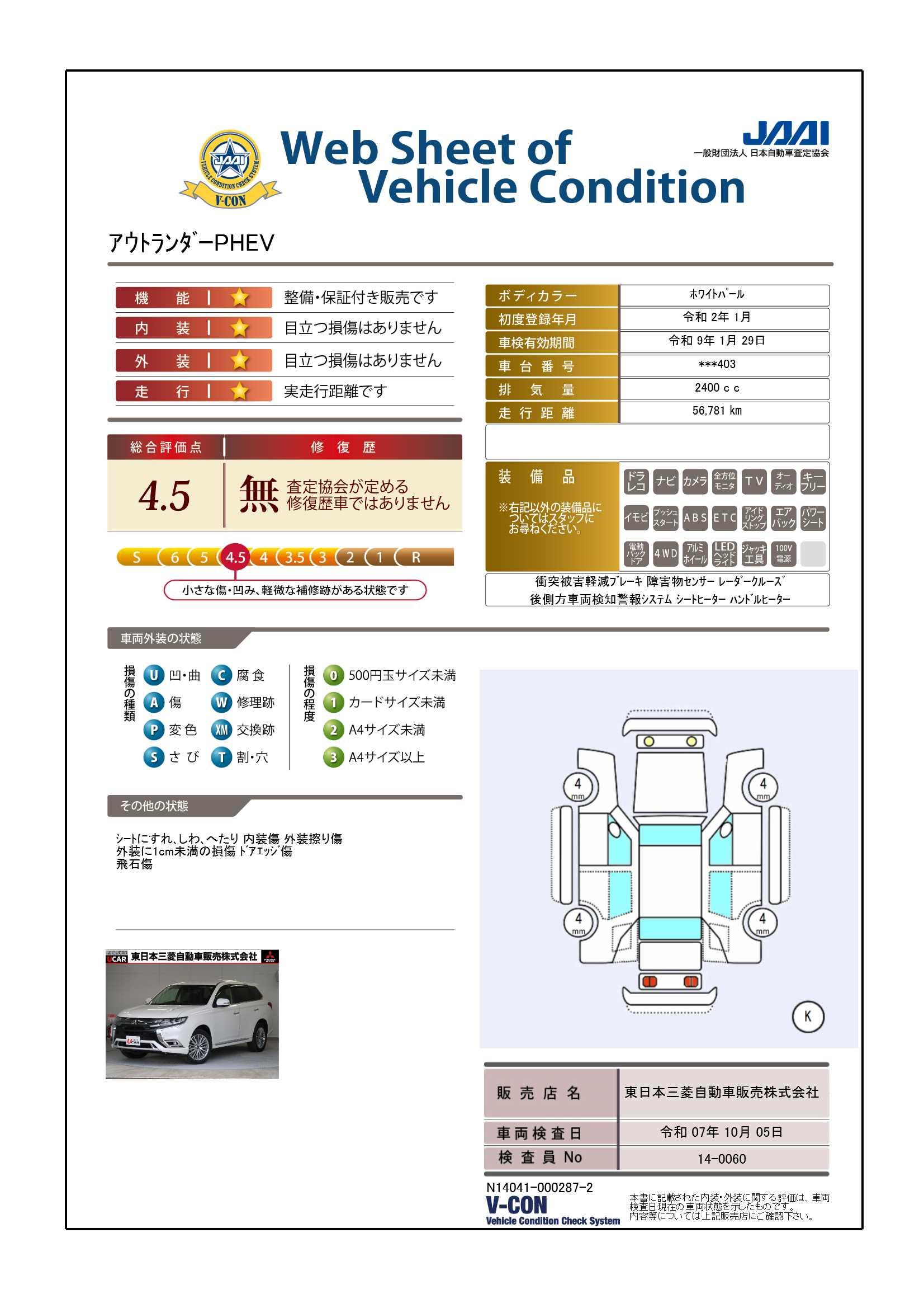 車両保証(アウトランダーPHEV G:東日本三菱自動車販売(株) UCAR福島)