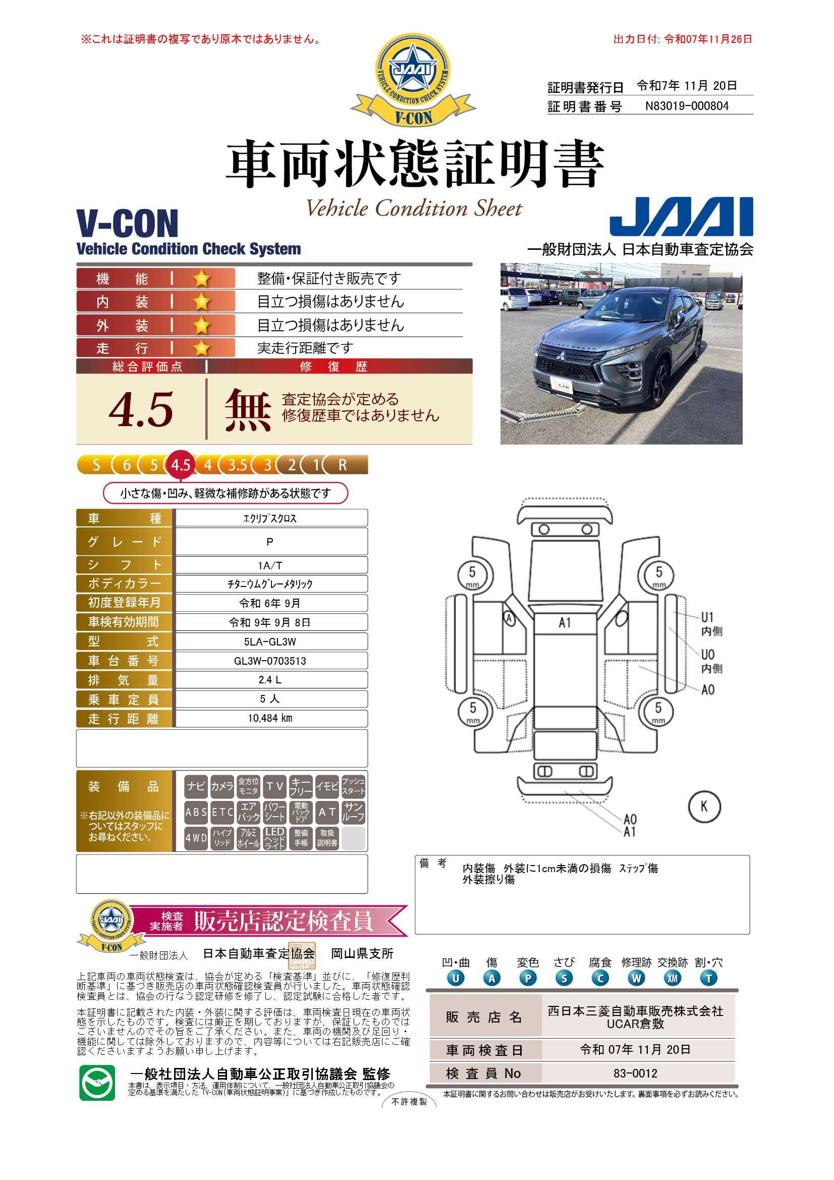 車両保証(エクリプスクロスPHEV P:西日本三菱自動車販売(株) UCAR倉敷)