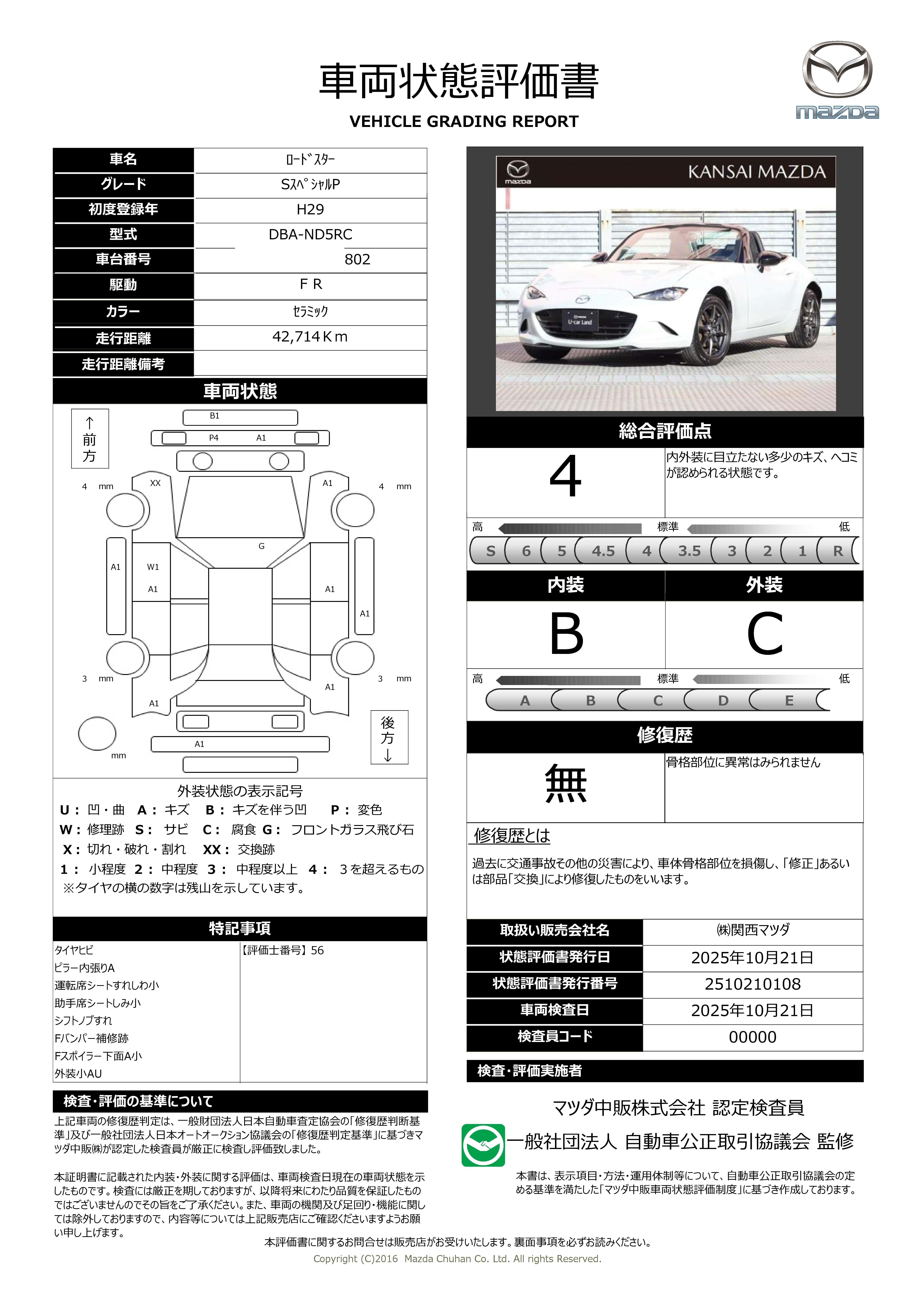 | 車両状態評価書 | ※クリックすると開きます![]() |