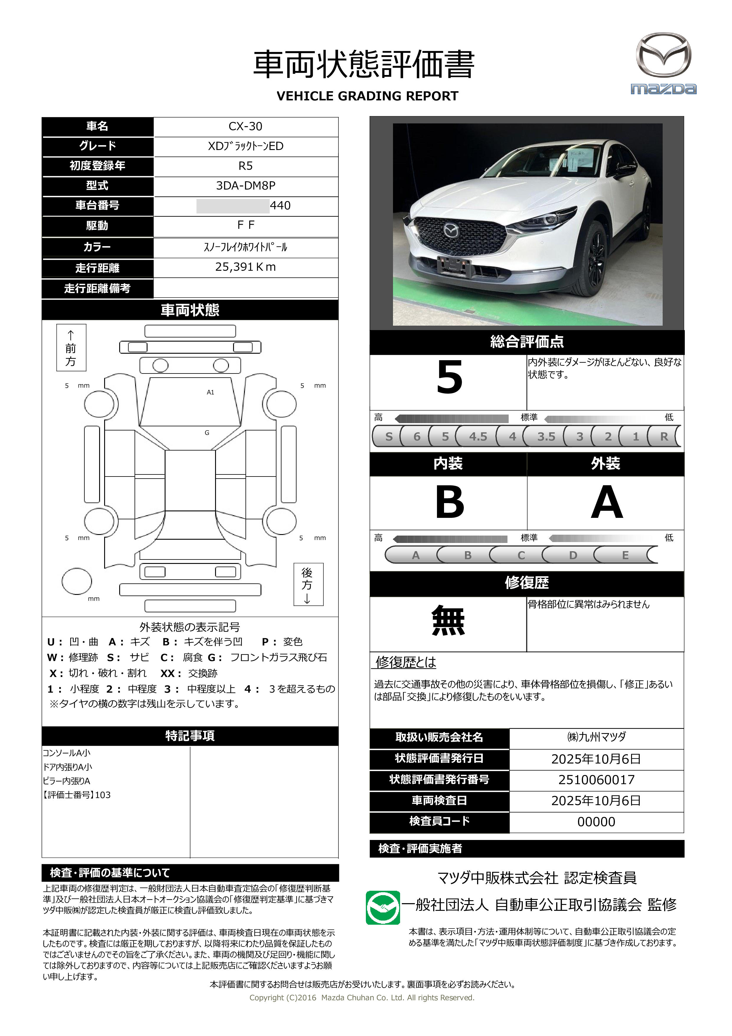 走行距離 | 2.5万km | 修復歴 | 無 |