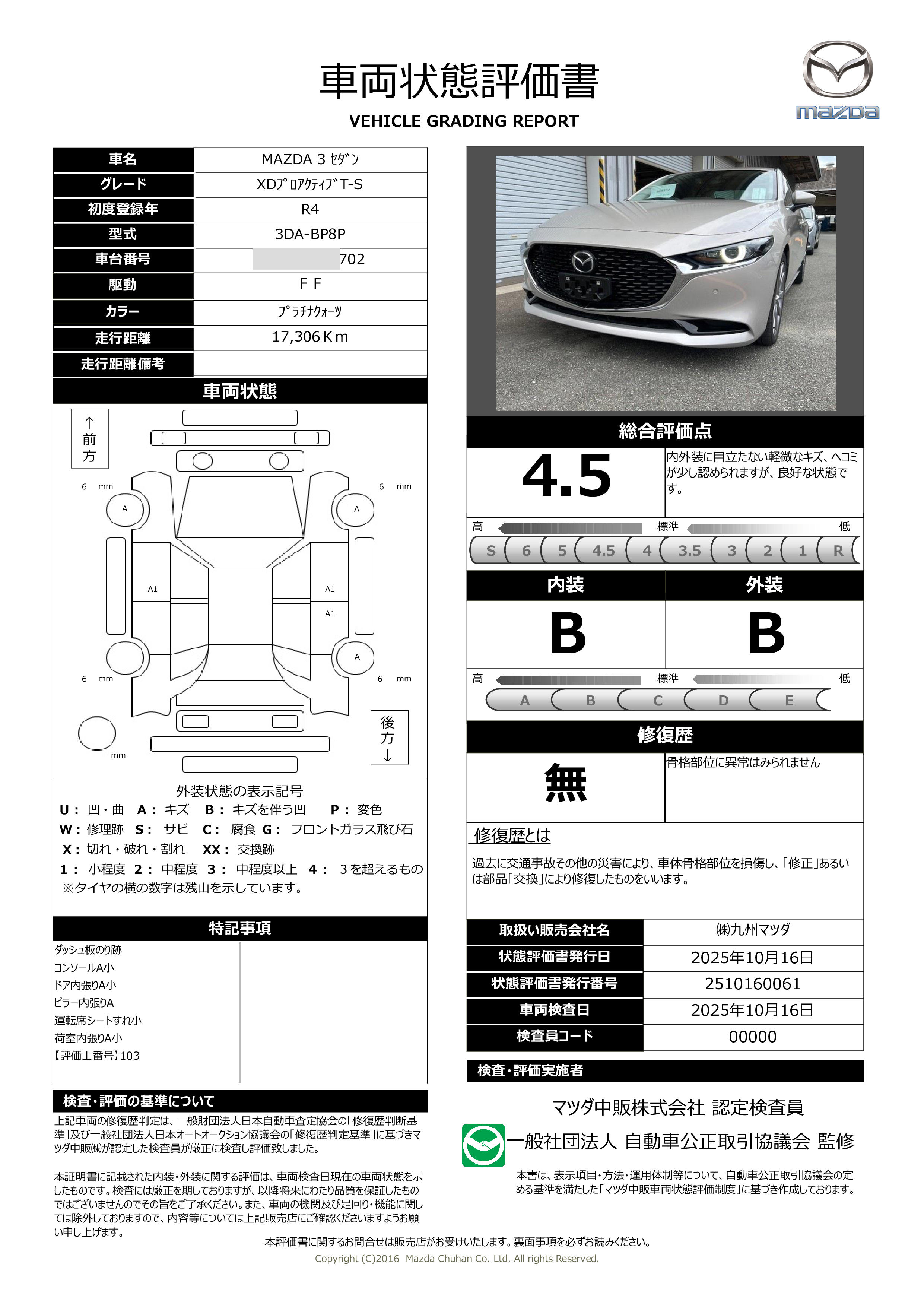 走行距離 | 1.7万km | 修復歴 | 無 |