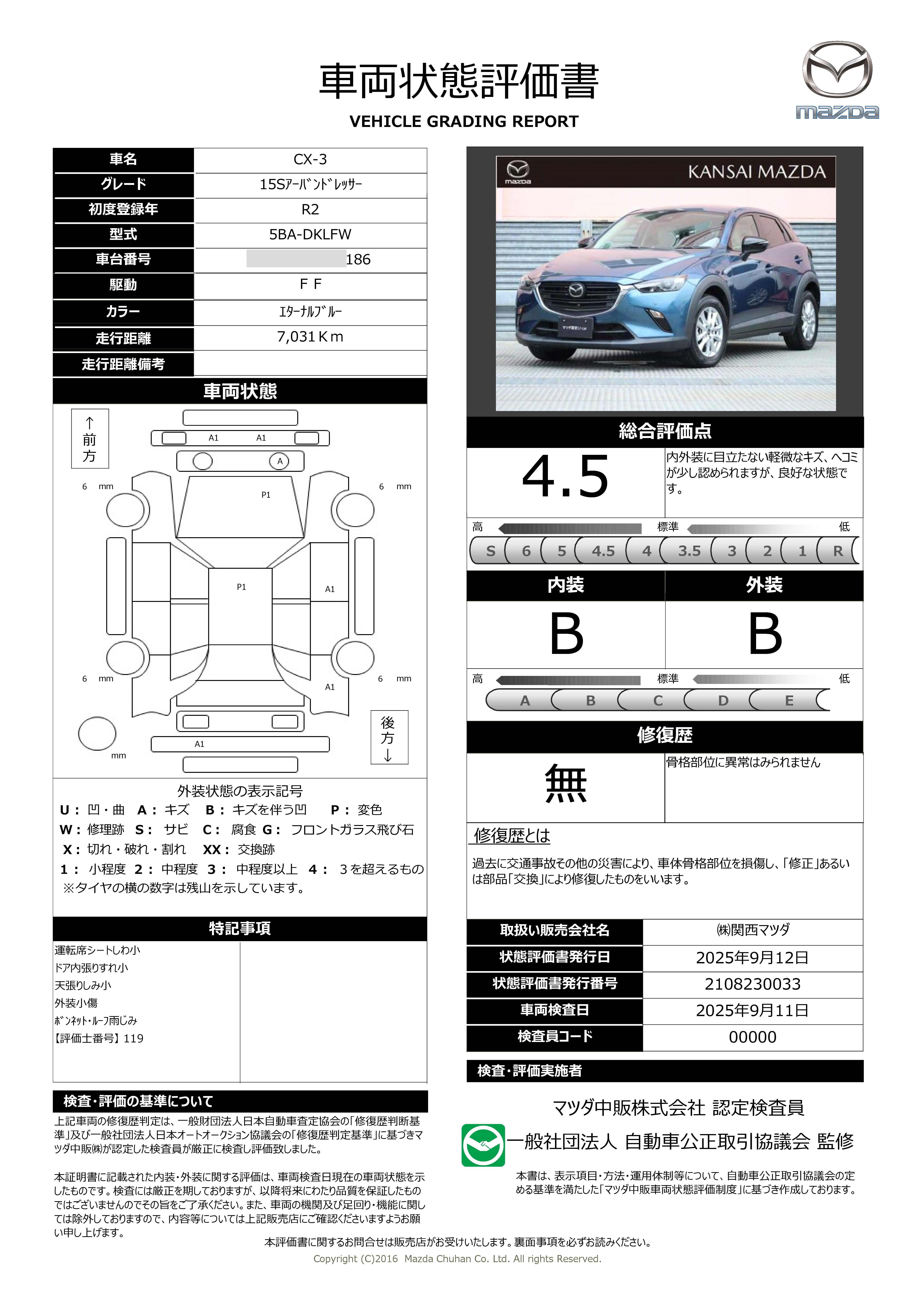 | 車両状態評価書 | ※クリックすると開きます![]() |