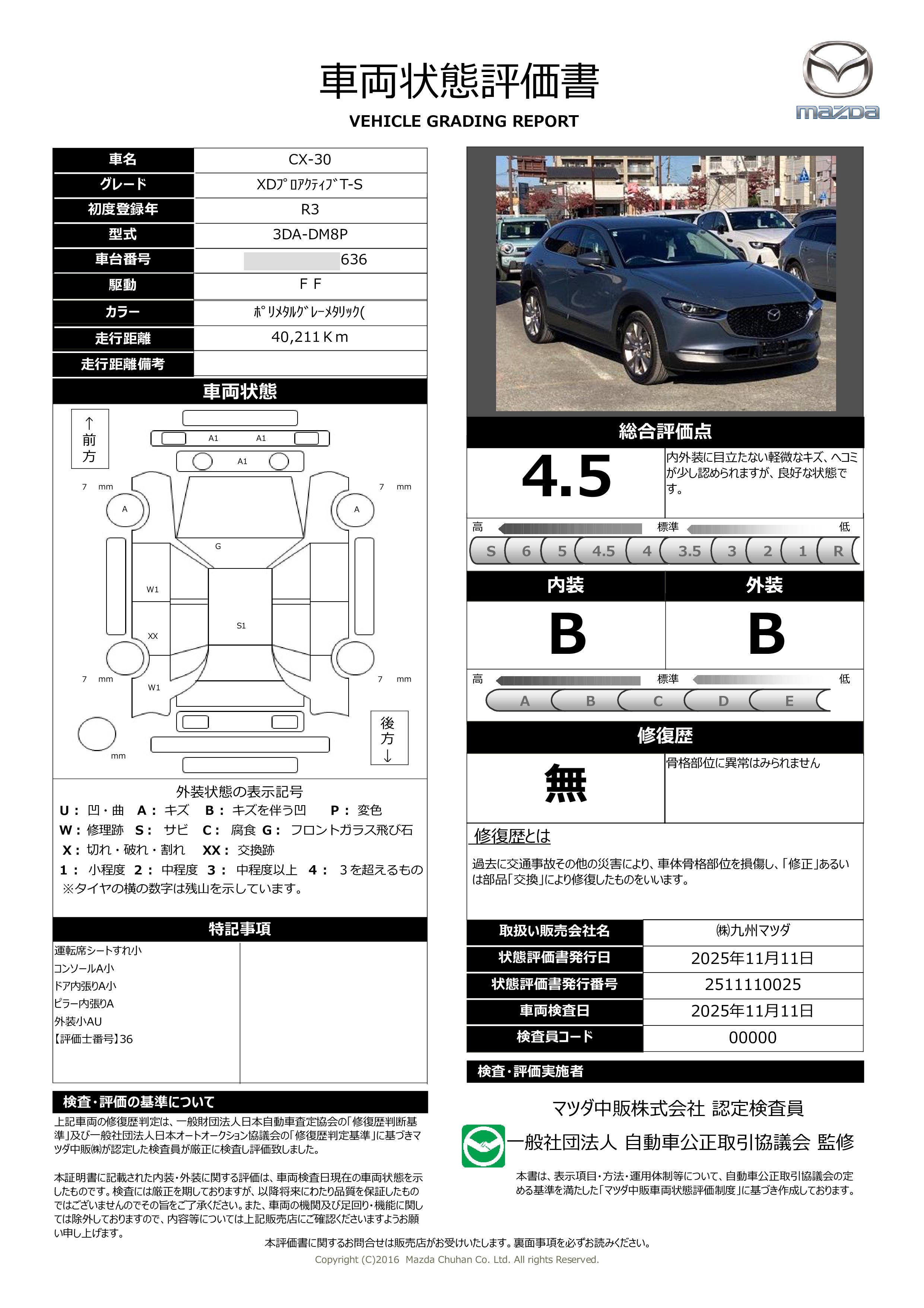 | 車両状態評価書 | ※クリックすると開きます![]() |