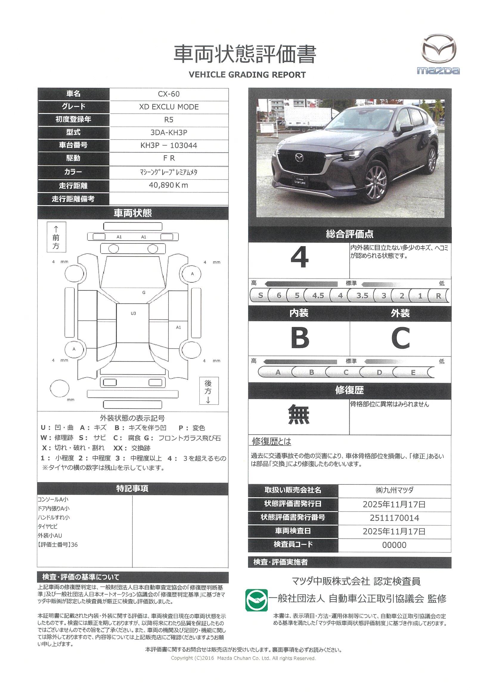 | 車両状態評価書 | ※クリックすると開きます![]() |