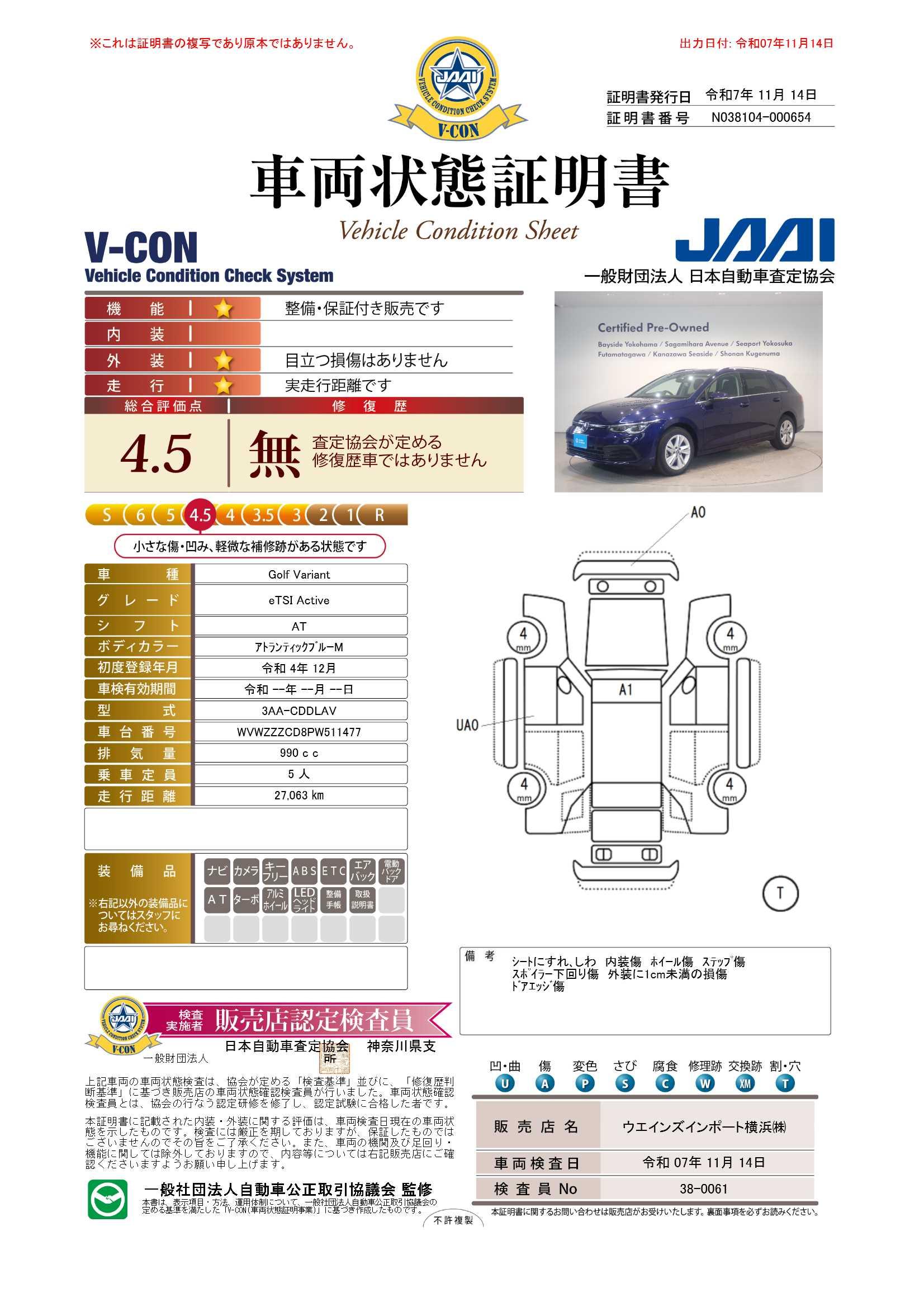 車両保証(ゴルフヴァリアント eTSI アクティブ:フォルクスワーゲン湘南鵠沼 ウエインズインポート横浜(株))
