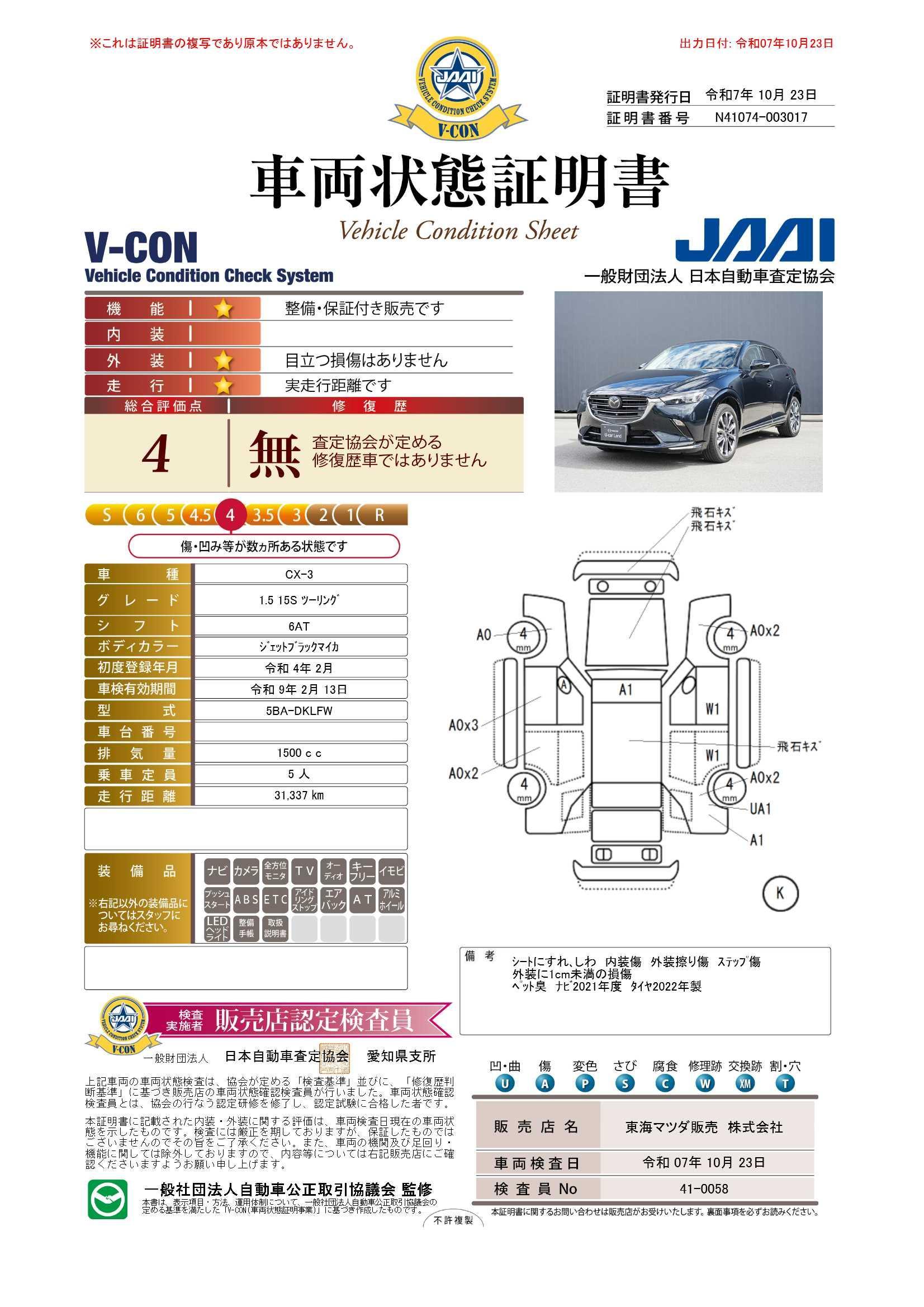 車両保証(CX-3 15S ツーリング:東海マツダ販売(株) 名岐店)