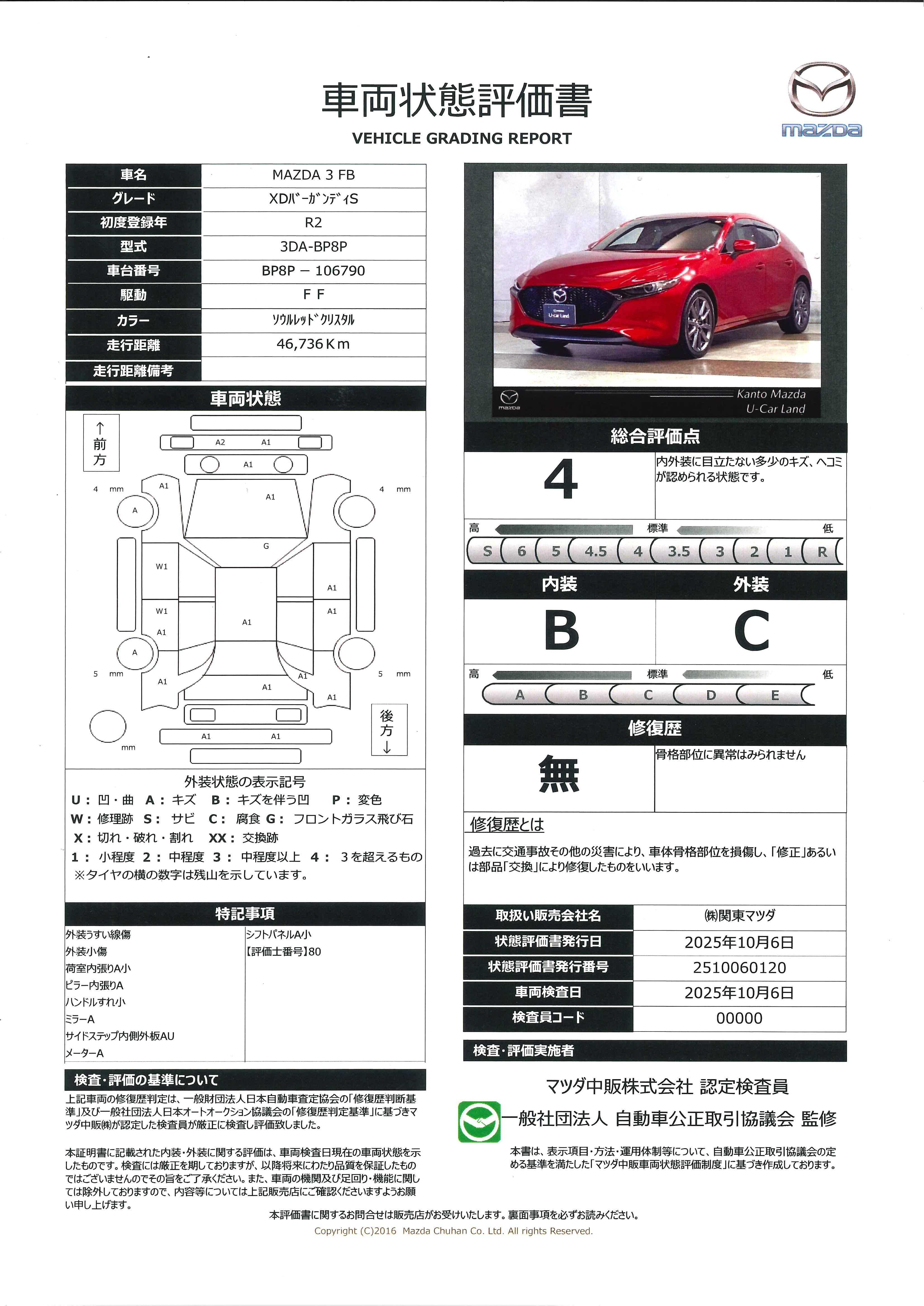車両状態(MAZDA3ファストバック XDバーガンディ セレクション)