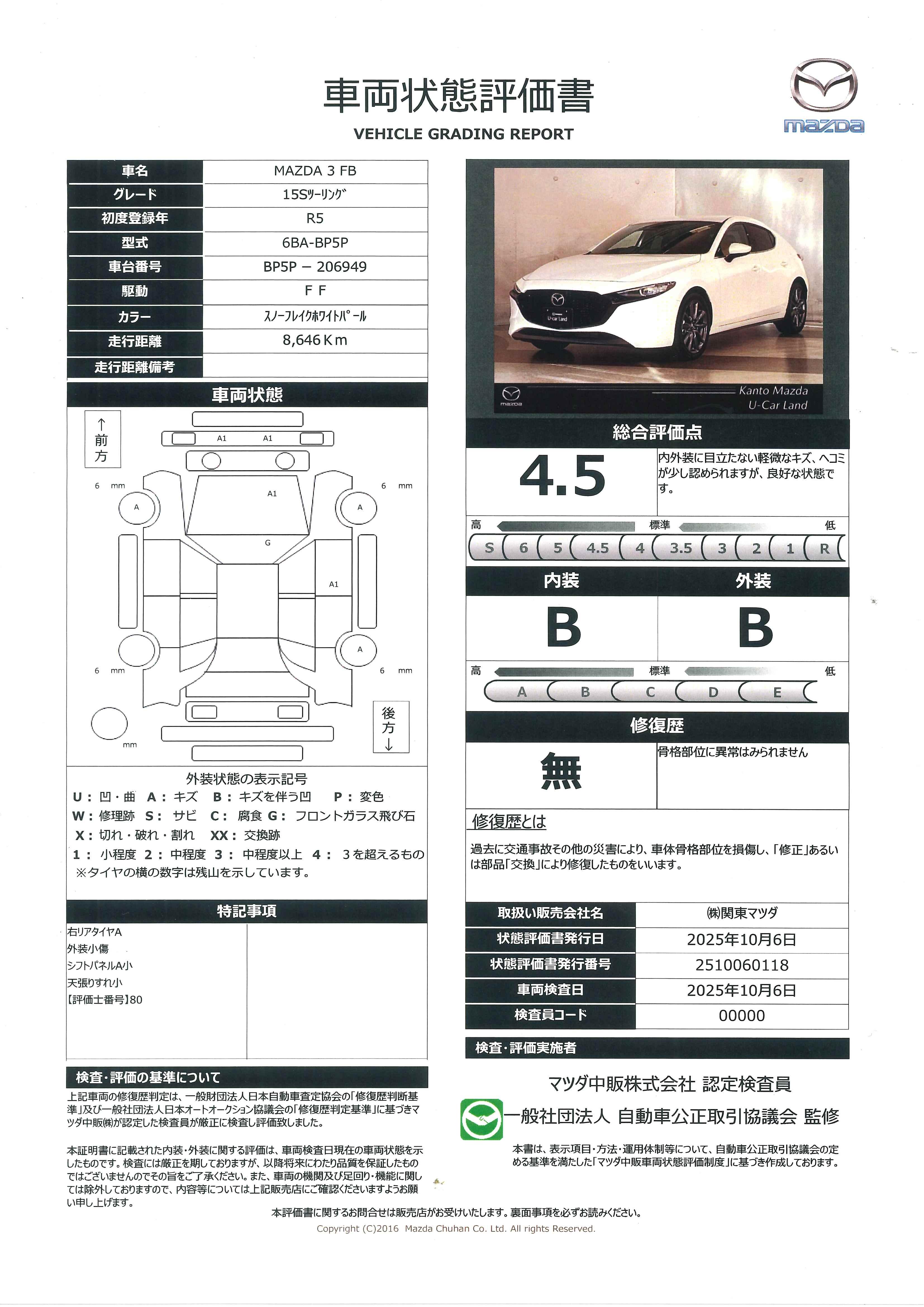 車両状態(MAZDA3ファストバック 15Sツーリング)