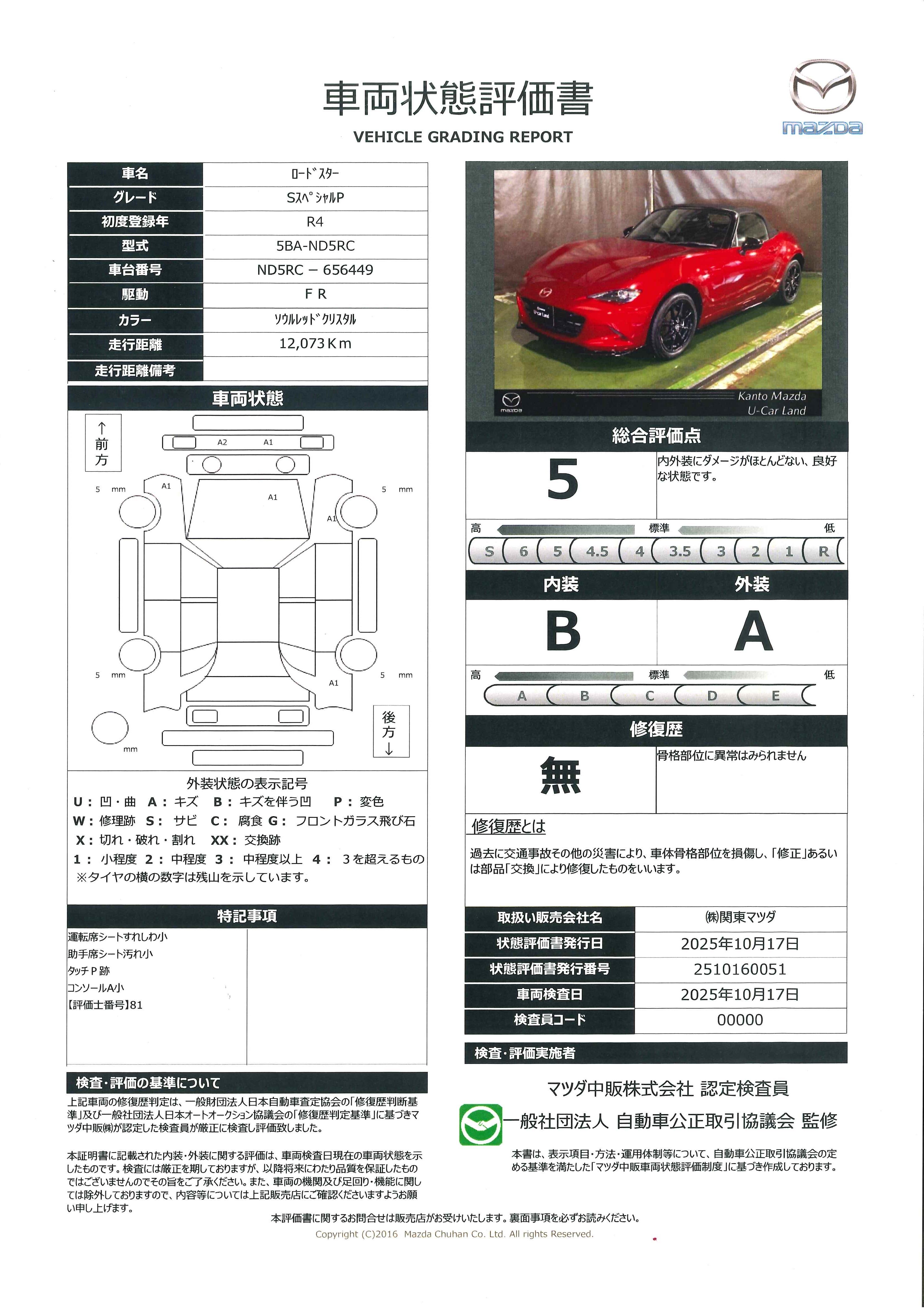 | 車両状態評価書 | ※クリックすると開きます![]() |