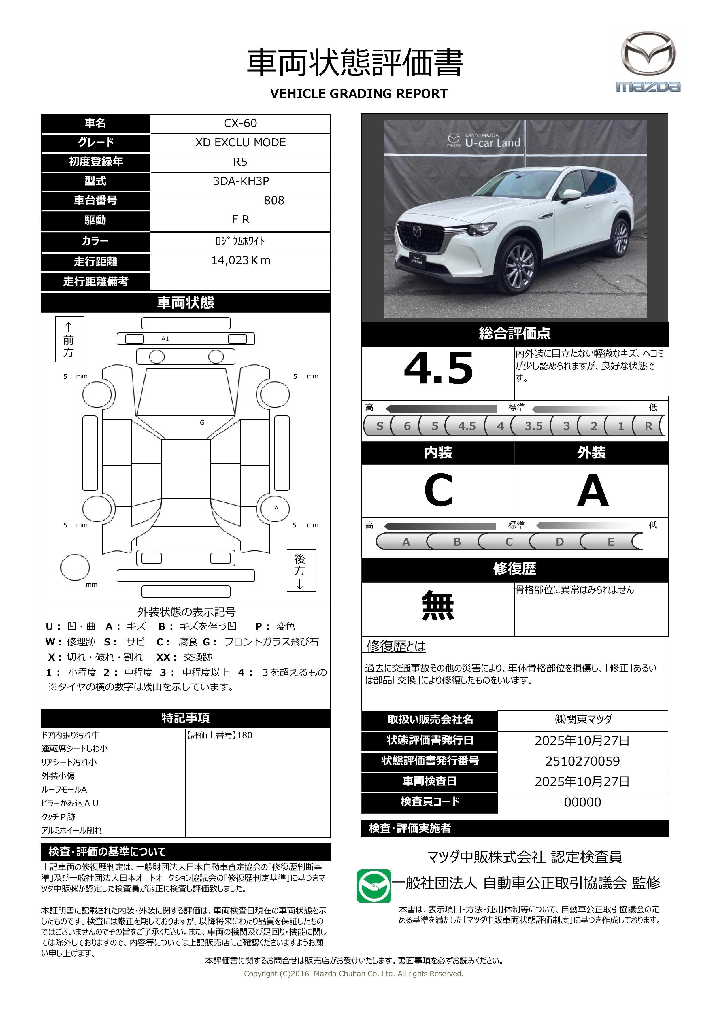 | 車両状態評価書 | ※クリックすると開きます![]() |