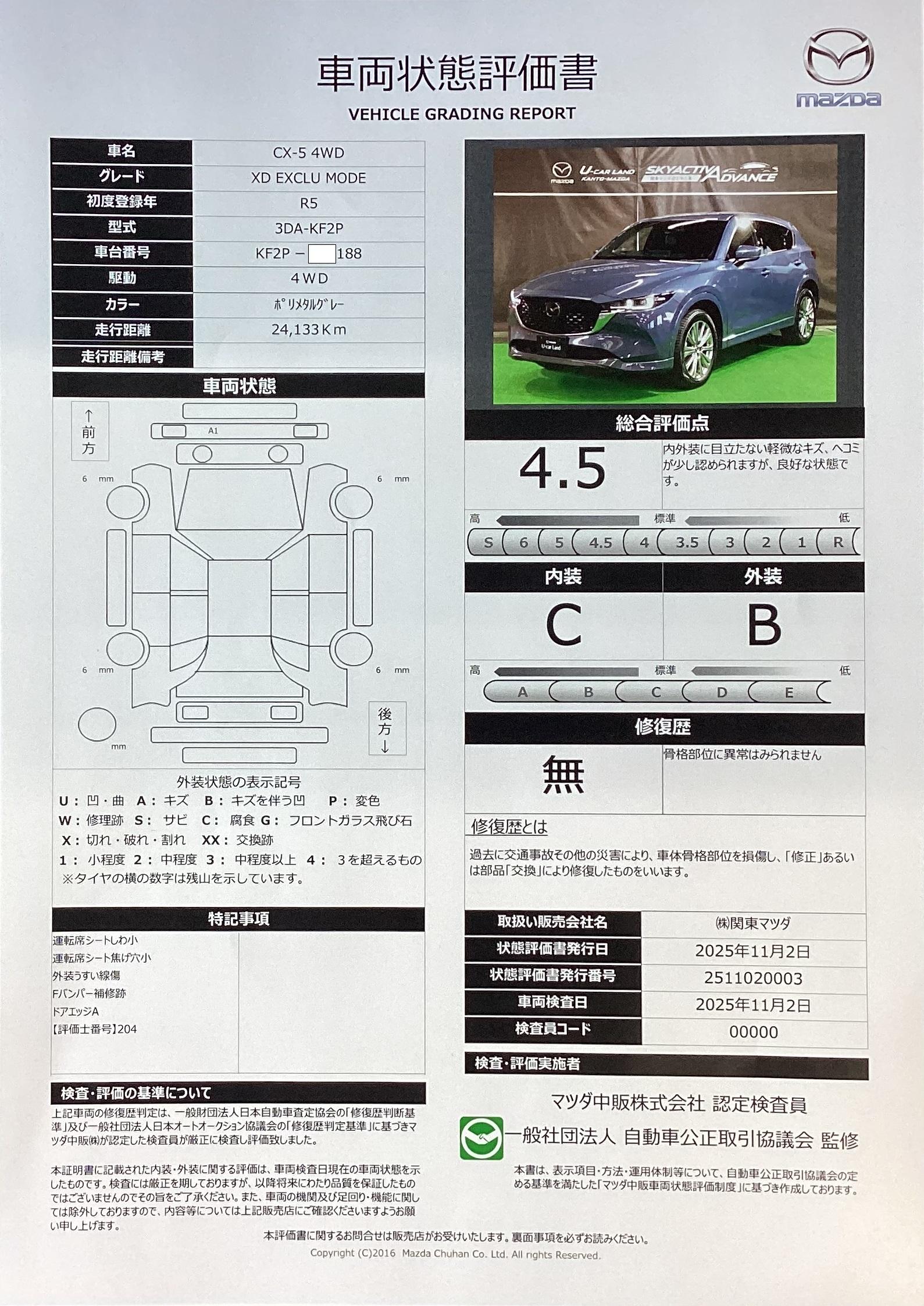 | 車両状態評価書 | ※クリックすると開きます![]() |