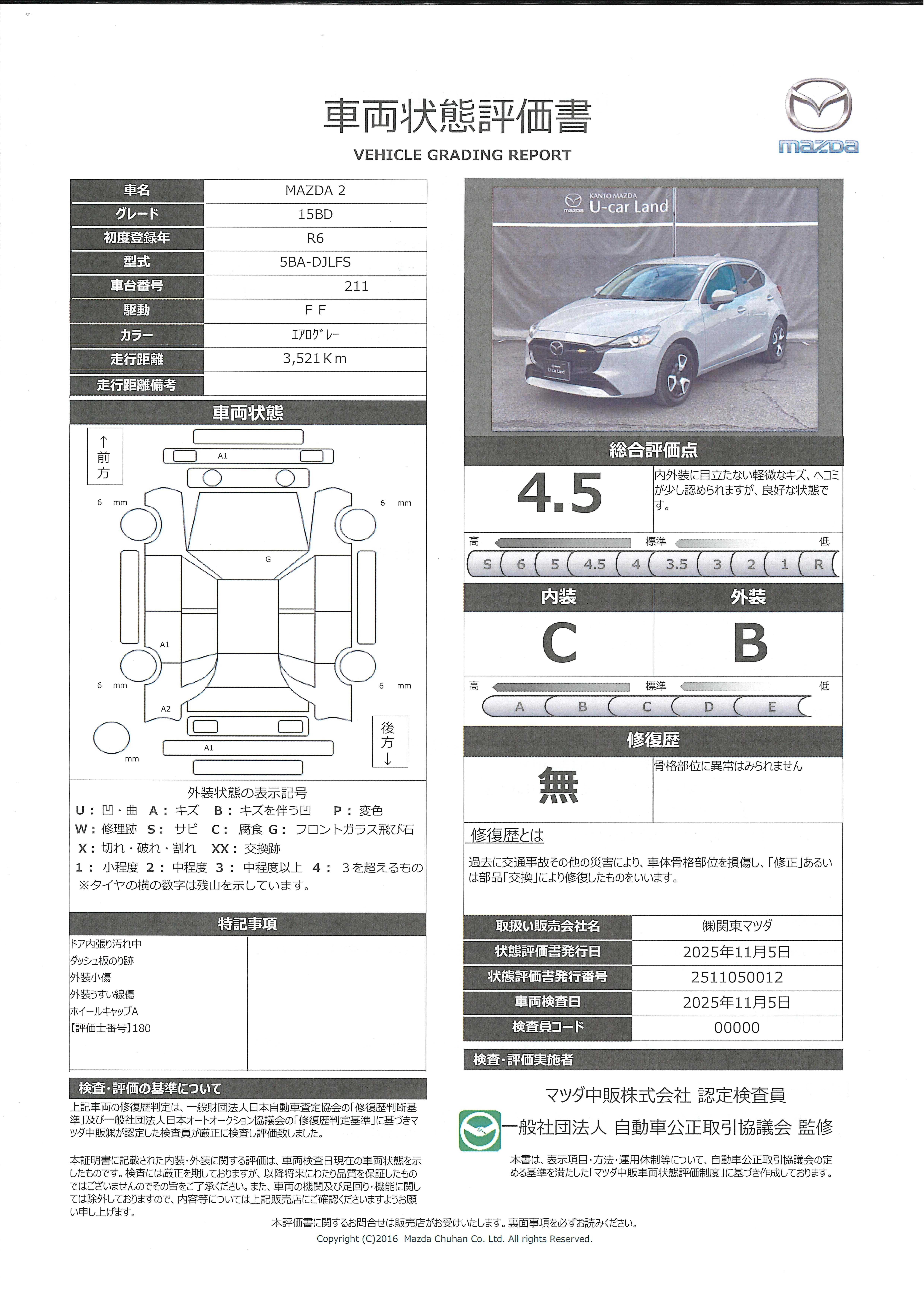 | 車両状態評価書 | ※クリックすると開きます![]() |