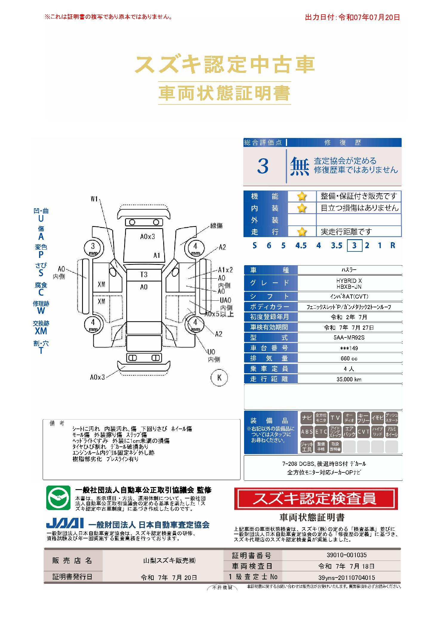 車両保証(ハスラー ハイブリッドX:山梨スズキ販売(株) U’sSTATION甲府昭和)
