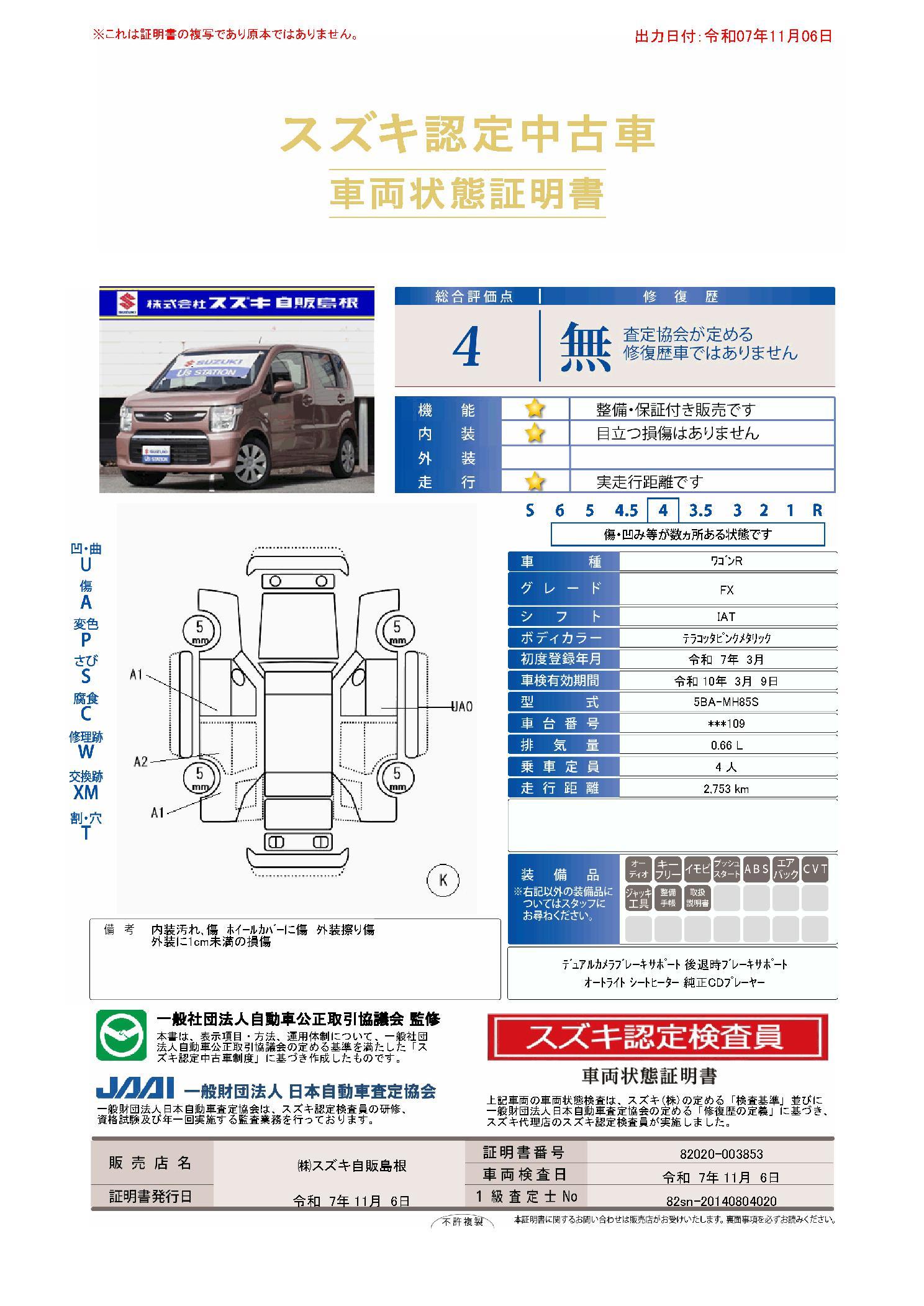 車両保証(ワゴンR FX:(株)スズキ自販島根 スズキアリーナ浜田)