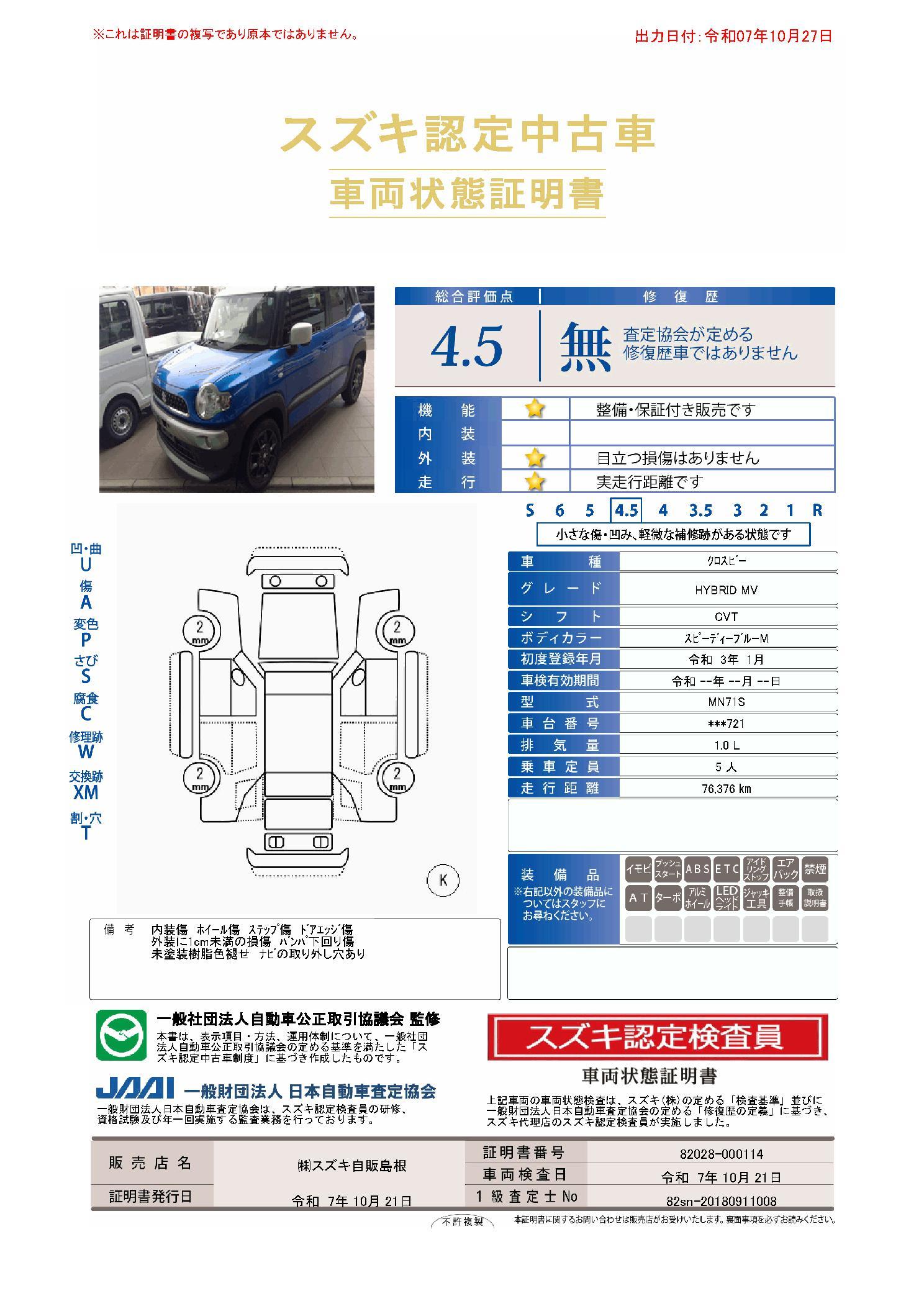 車両保証(クロスビー ハイブリッドMV:(株)スズキ自販島根 スズキアリーナ出雲)